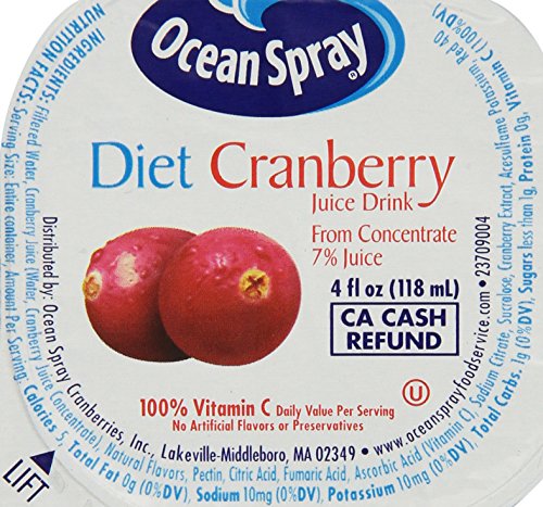 Q: What is the serving size of Ocean Spray Diet Cranberry Juice Cups?A: Each Ocean Spray Diet Cranberry Juice Cup contains 4 fluid ounces, making them perfect for a quick, single-serve refreshment.