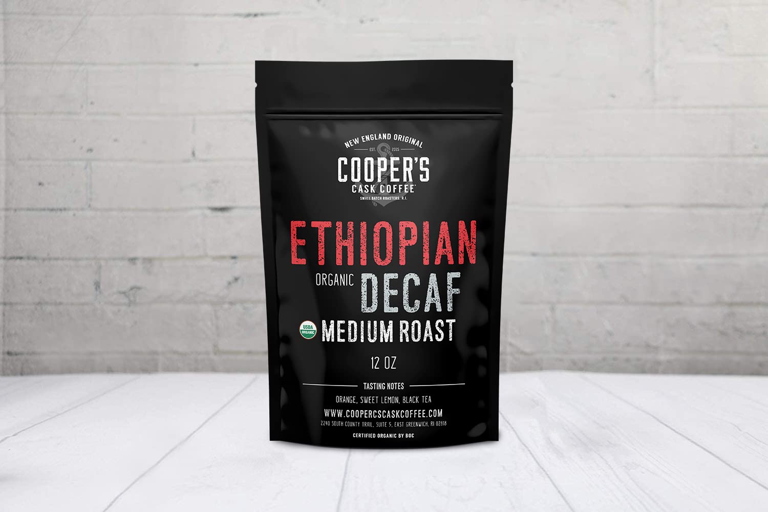 - Q: What makes Cooper's Organic Ethiopian Decaf coffee unique? A: Cooper's Organic Ethiopian Decaf coffee is unique due to its single origin and Swiss Water Processed (SWP) decaffeination method, which preserves the bean's natural flavors without using harsh chemicals. This medium roast offers a vibrant taste profile with notes of chocolate orange, sweet lemon, and black tea, ensuring a complex yet balanced cup.