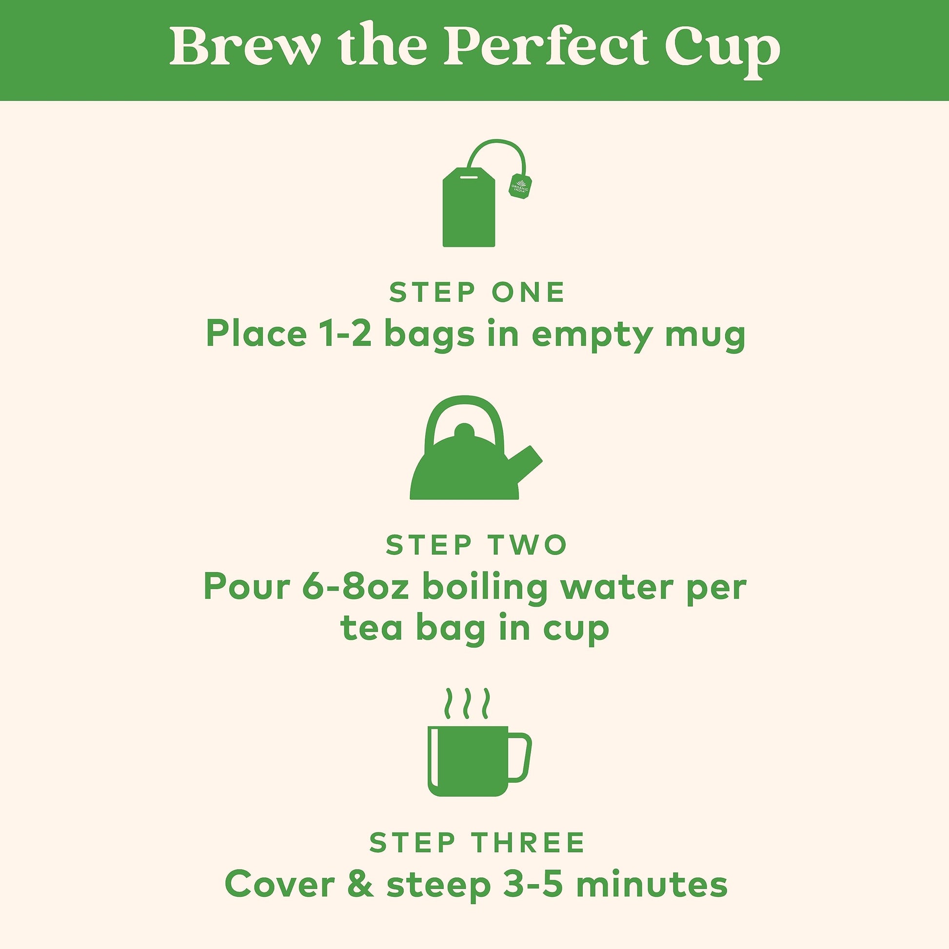 - Q: What is the best way to brew Organic India Tulsi Green Tea for optimal flavor? A: To brew Organic India Tulsi Green Tea, steep one infusion bag in hot water (not boiling) for 3-5 minutes. This allows the rich flavors and health benefits to fully develop, providing a delicious and refreshing experience.
