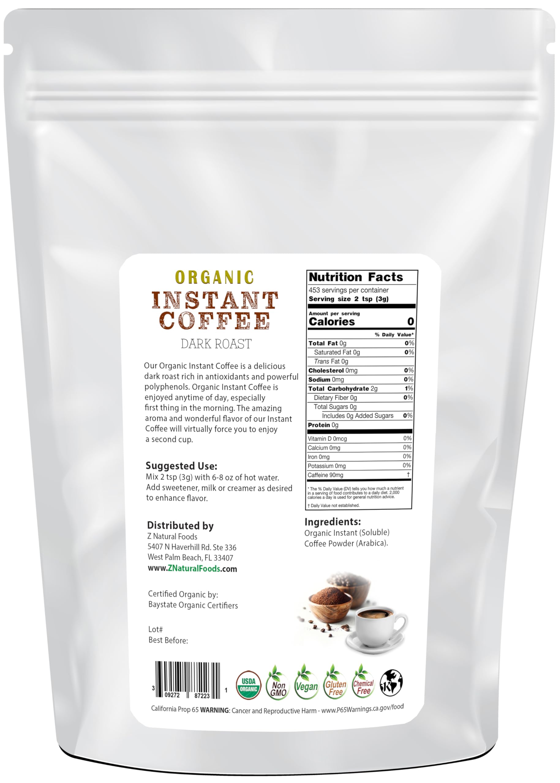 - Q: What makes Z Natural Foods Organic Instant Coffee Powder different from regular instant coffee? A: Z Natural Foods Organic Instant Coffee Powder is made from premium organic Arabica coffee beans, offering a rich dark roast flavor and higher antioxidant content compared to regular instant coffee. It is gluten-free, vegan, and non-GMO, ensuring a healthier choice for coffee lovers.