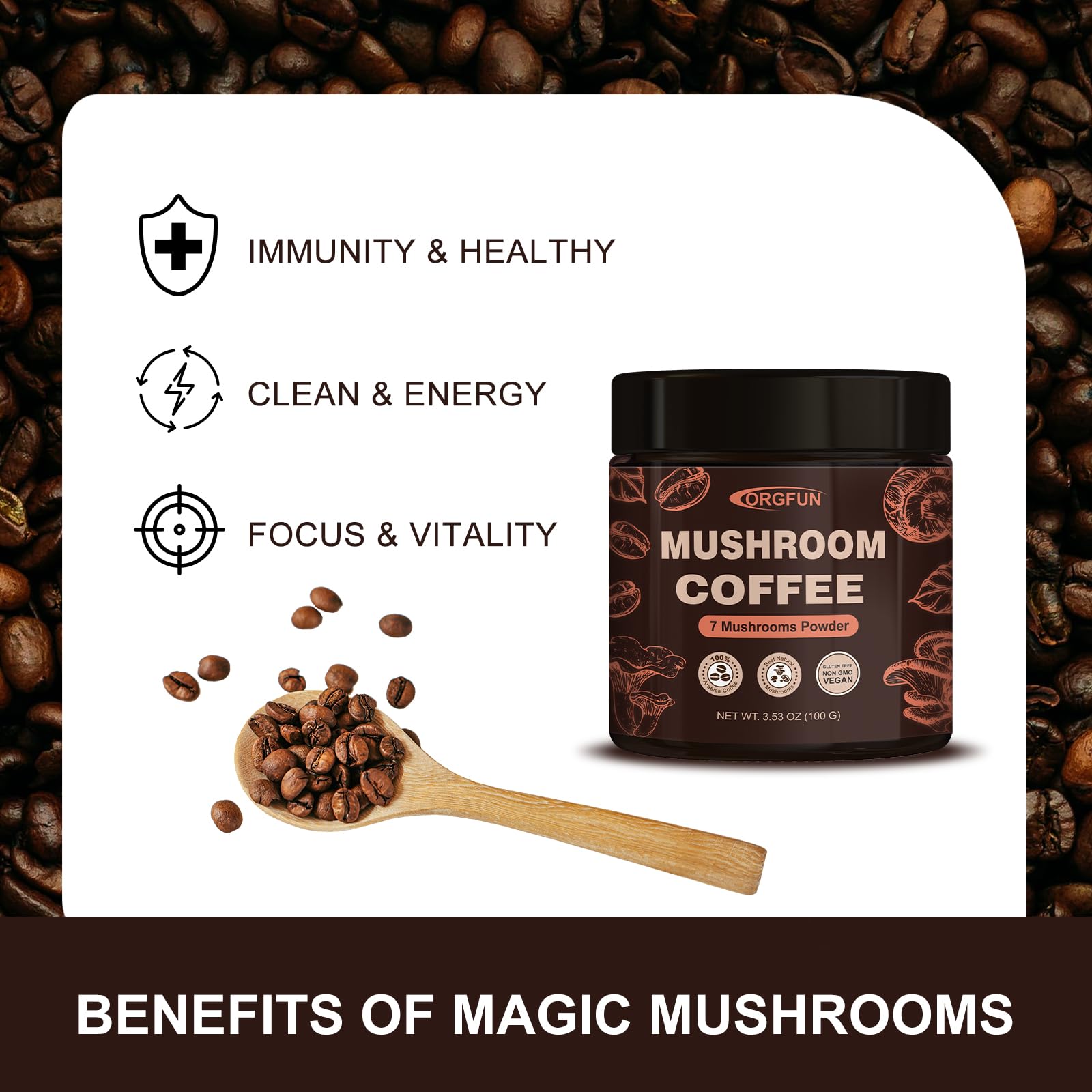 - Q: What are the benefits of consuming ORGFUN Premium Mushroom Coffee? A: ORGFUN Premium Mushroom Coffee is enriched with 7 superfood mushrooms, including Chaga, Lion's Mane, and Reishi, which may enhance cognitive function, boost immunity, and promote overall well-being. Additionally, it provides a rich coffee flavor without the jitters typically associated with regular coffee.