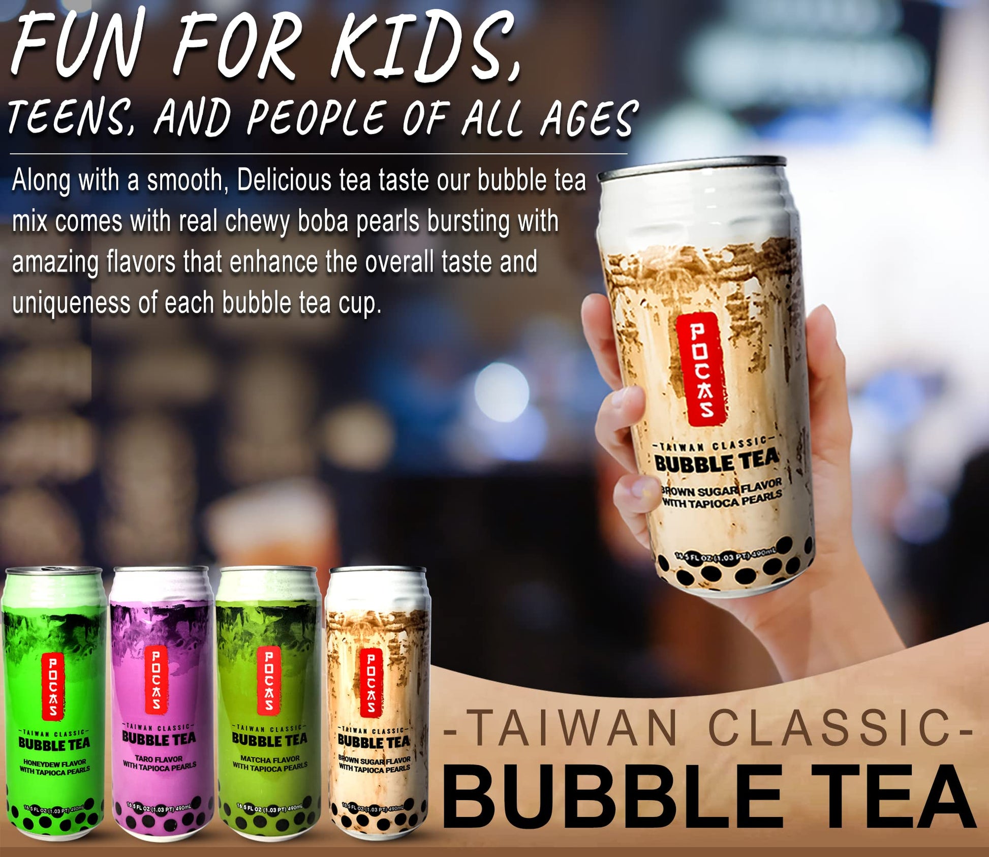- Q: What is POCAS Bubble Tea and how is it different from other boba teas? A: POCAS Bubble Tea is a ready-to-serve, classic Taiwan style milk tea with tapioca pearls, designed for convenience and great taste. Unlike many boba teas that require preparation, ours comes in a can and is ready to enjoy straight away, making it a unique option for bubble tea lovers.