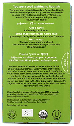 You are a seed waiting to flourish. You know potential is ready to flower. Feed it with delicious nurturing herbs; a cup of sweet fennel seeds soothed with wild fennel and feathery fennel leaf. A feast of flavour to help smooth your way. Flourish with delight. Every Pukka plastic-free tea bag comes in its own recyclable envelope to retain the essential oils in our organic herbs. Each bag has two chambers, allowing these incredible herbs to flow and release the full potency in your cup. To help the flavours to fully disperse, pour boiling water directly on the bag. Every herb loves the water, so leave them to steep for the perfect brew. Infuse for up to 15 minutes. Boiling just the water you need helps make every cup of Pukka tea as sustainable as it can be. Good news for helping you blossom, deliciously sweet, aromatic and soothing. At Pukka, our heartfelt desire is to create a healthier, happier world through the incredible power of organic herbs. We hope you feel inspired to discover more about yourself and the beautiful planet on which we all live. Doing good things helps make good things happen. We create things that help you, help nature and everything in-between. It’s called conservation through commerce – striving to positively change the world for you, business and the planet. We are a B Corp organisation, Giving back 1% for the Planet, Fair for Life and FairWild certified. If you enjoy Three Fennel, why not discover, Mint Matcha Green, Mint Refresh, Peppermint and Licorice, Three Mint, Feel New.