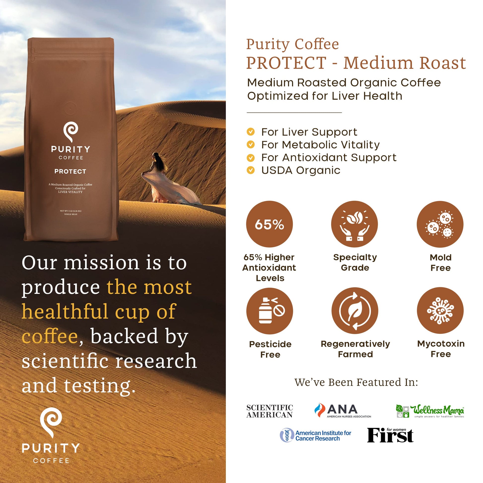 - Q: What makes Purity Coffee PROTECT different from other coffee brands? A: Purity Coffee PROTECT is uniquely formulated to preserve antioxidant compounds, specifically targeting liver health and metabolic vitality. Unlike many other brands, it uses specialty grade organic Arabica beans that are rigorously tested for mold, mycotoxins, and pesticides, ensuring a pure and health-focused coffee experience.