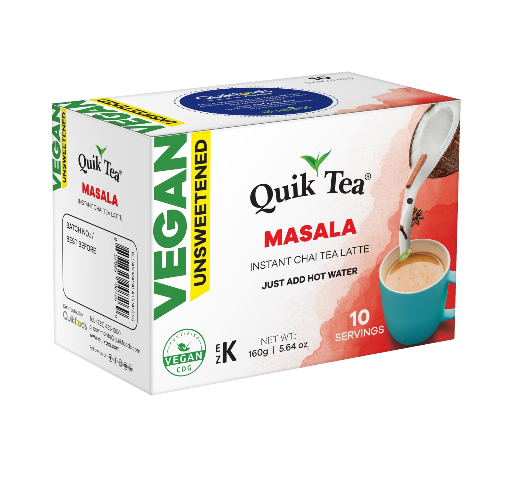 - Q: How do I prepare QuikTea Vegan Unsweetened Masala Instant Chai Tea Latte? A: To prepare QuikTea Vegan Unsweetened Masala Instant Chai Tea Latte, simply empty the contents of one pouch into a cup, add hot water, mix well, and enjoy. This easy preparation makes it a convenient option for any time of the day.