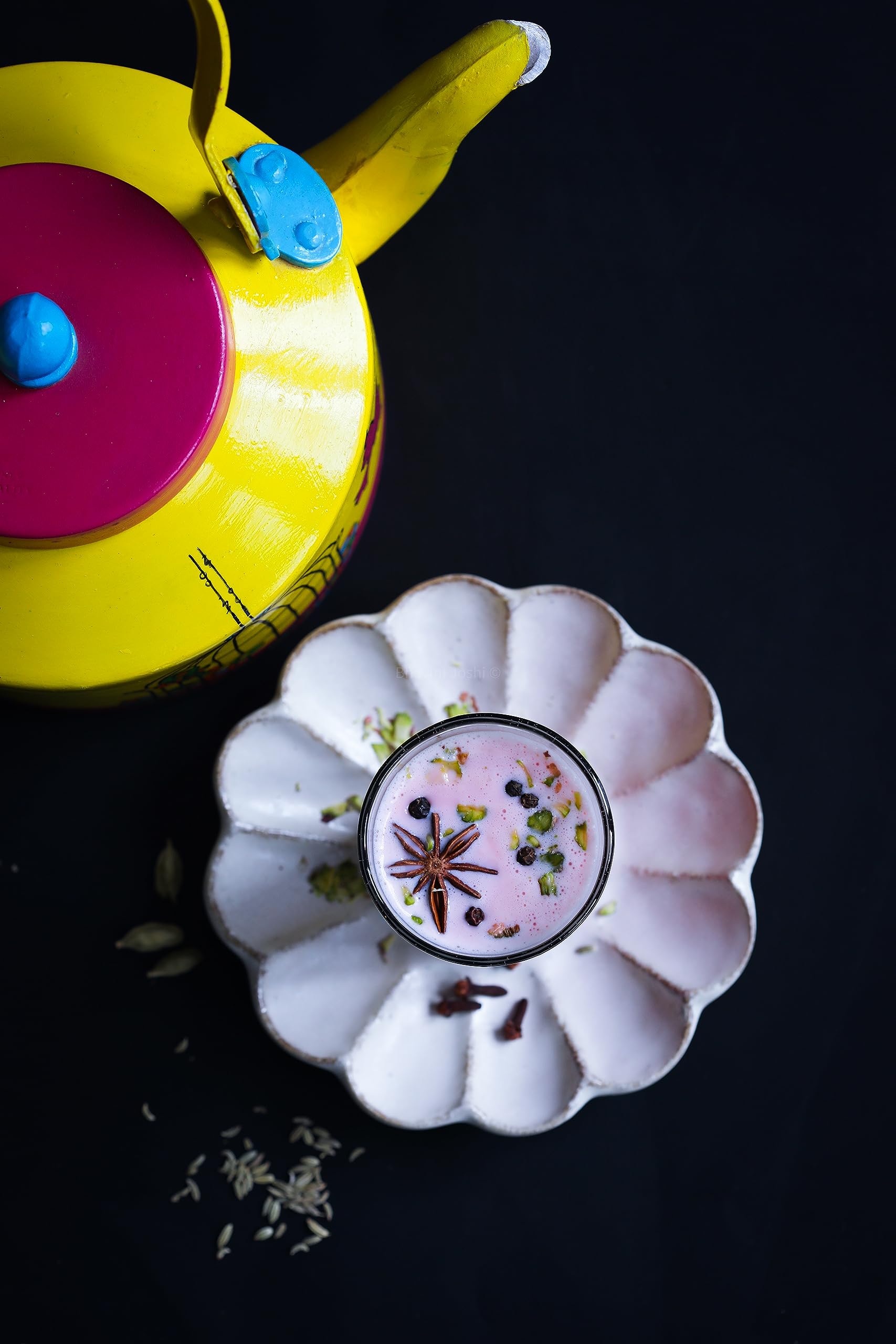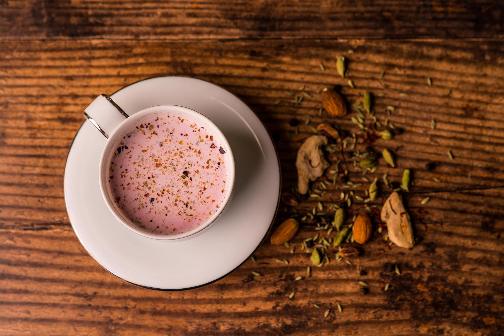 Q: What are the key ingredients in Royal Chai Instant Pink Tea?A: The key ingredients in Royal Chai Instant Pink Tea include sugar, skimmed milk powder, green tea extract, natural cardamom, ginger, black pepper, beetroot, fennel, and saffron, ensuring a rich and flavorful chai experience.