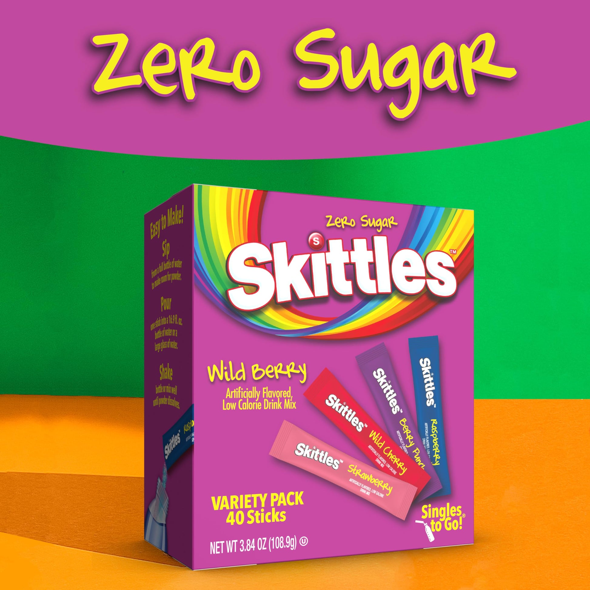 Now You Can Bring The Taste Of The Rainbow With You Everywhere You Go Skittles Singles To Go Drink Mix Sticks Are Bursting With Fun Fruit Flavor That Will Add Tasty Excitement To Your Day. With 40 Sticks Included, Youll Get A Taste Of 4 Different Fruity Flavors Including Strawberry, Orange, Green Apple, And Grape. They Are Low-Calorie Water Enhancers That Have Zero Sugar, So You Can Feel Great About Sharing Them With The Whole Family. To Experience The Exciting Flavor, Take A Sip From A Full Bottle Of Water To Make Room For The Powder. Pour One Stick Into A 16.9 Fl. Oz. Bottle Or Large Glass Of Water, Shake Until Well Mixed, And Enjoy.
