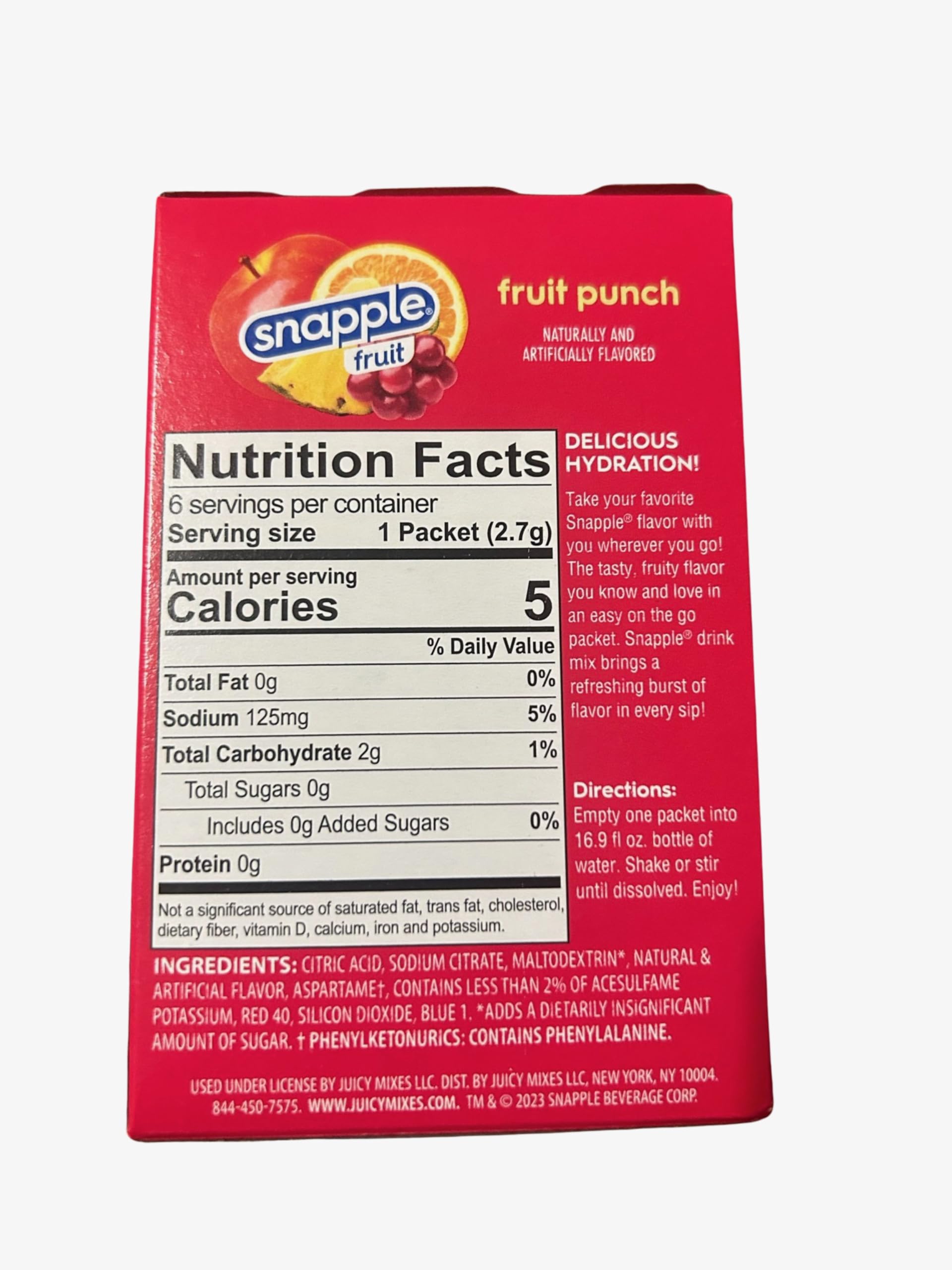 Q: What is included in the pack of Snapple Fruit Punch Drink Mix?A: The pack contains 6 individual powder sticks, each designed for easy use. Each stick is 0.1 ounce, providing a convenient way to add flavor to your drinks.