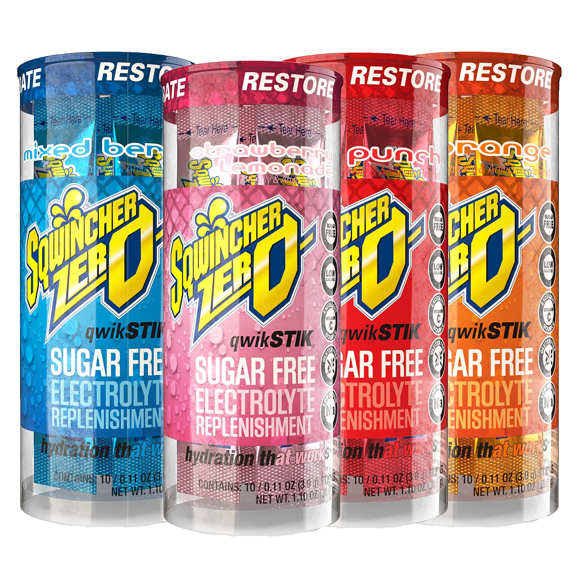 Q: What flavors are included in the Sqwincher Zero Qwik Stik Variety Pack?A: The Sqwincher Zero Qwik Stik Variety Pack includes four delicious flavors: mixed berry, strawberry lemonade, fruit punch, and orange.