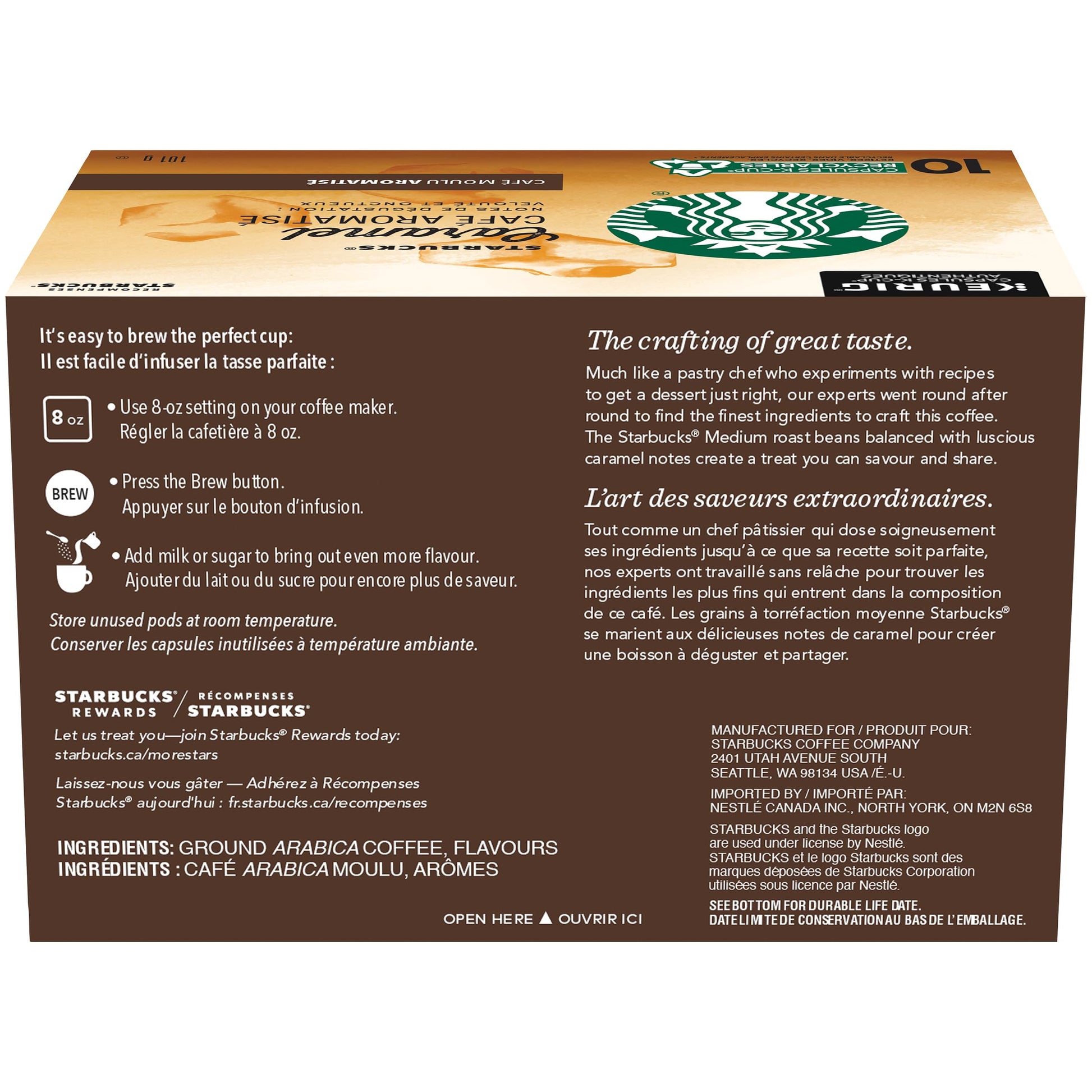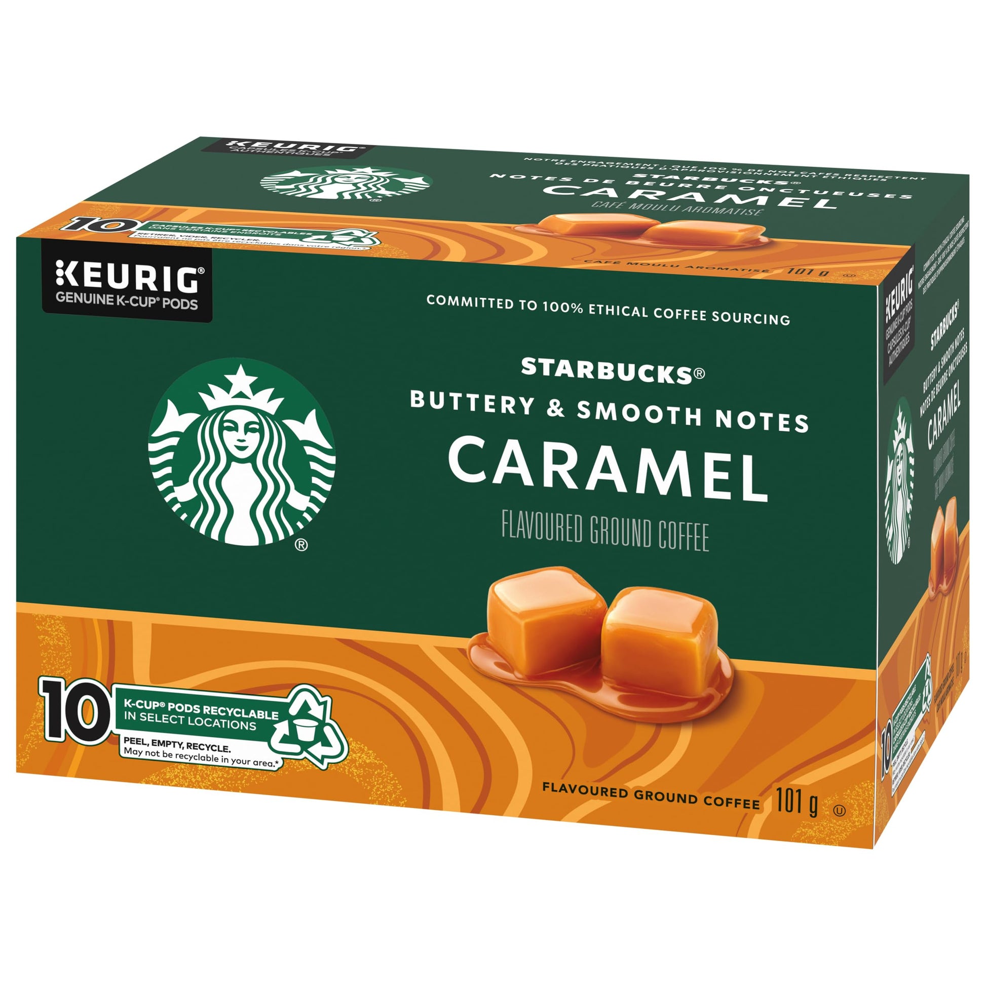 Starbucks Caramel Flavored Coffee K-Cup Pods 10Ct, 101G/3.5 Oz. With Smooth And Buttery Tasting Notes, This Caramel Coffee Creates Moments To Savor. Caramel Flavor Blended With Medium-Roasted Coffee, Adding Just The Right Touch Of Richness To Every Cup. So Simple. So Sweet. Moments To Savor, From The Brewing Aroma To The Very Last Sip. Flavorful Without Being Overly Bold, This Coffee Brews A Delightfully Gracious Cup That&Rsquo;S Perfect For Welcoming Friends Or Greeting A New Day. Caramel Coffee Is Wonderful Paired With Chocolate Chip Cookies Or Pecan Rolls. Designed For Use With The Keurig Single Cup Brewing System To Provide A Premium Brewed Coffee Experience In Less Than A Minute &Ndash; Without The Mess. So Sweet. So Simple. Buttery &Amp; Smooth. Caramel Coffee. 100% Arabica Coffee. K-Cup Pods.