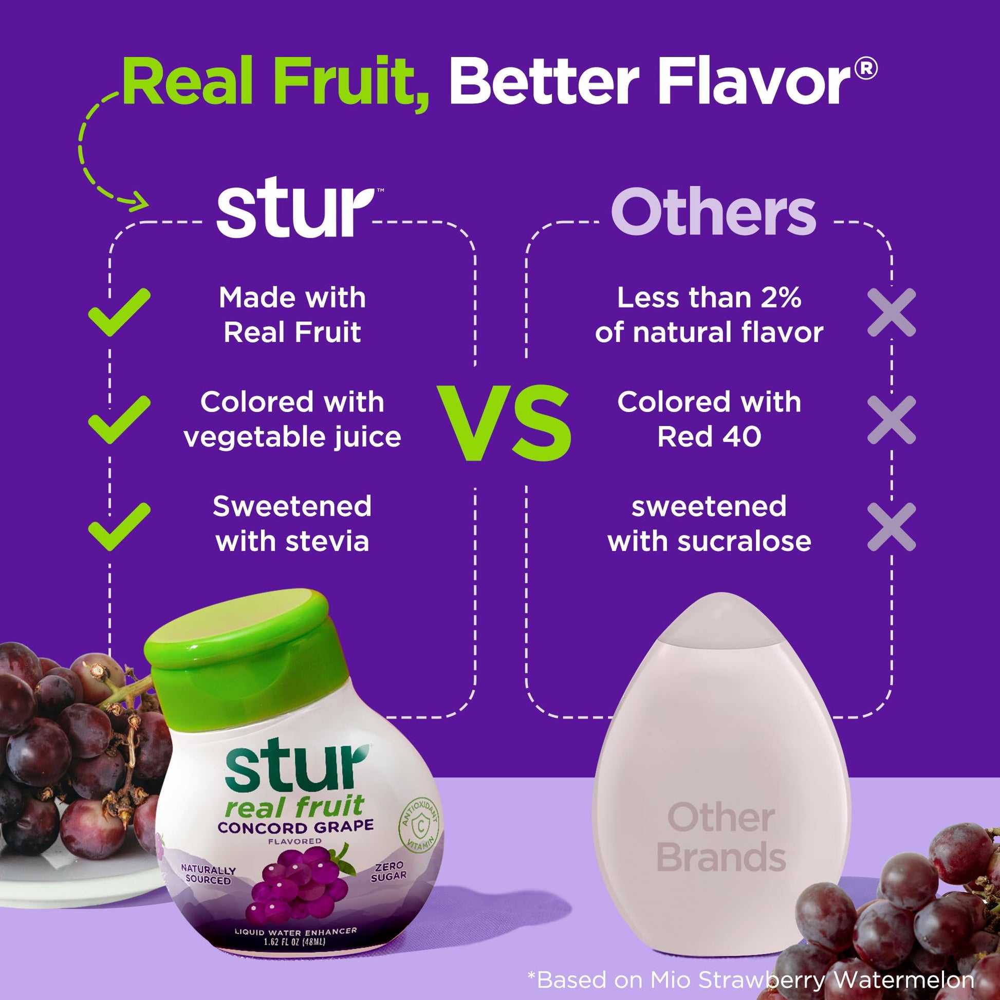 - Q: What are the main benefits of using Stur Liquid Water Enhancer? A: Stur Liquid Water Enhancer provides a delicious Grape Acai flavor while being sugar-free and zero calories. It is sweetened with stevia, making it a great option for those following a keto or vegan diet. Additionally, it is high in Vitamin C and antioxidants, contributing to overall health.