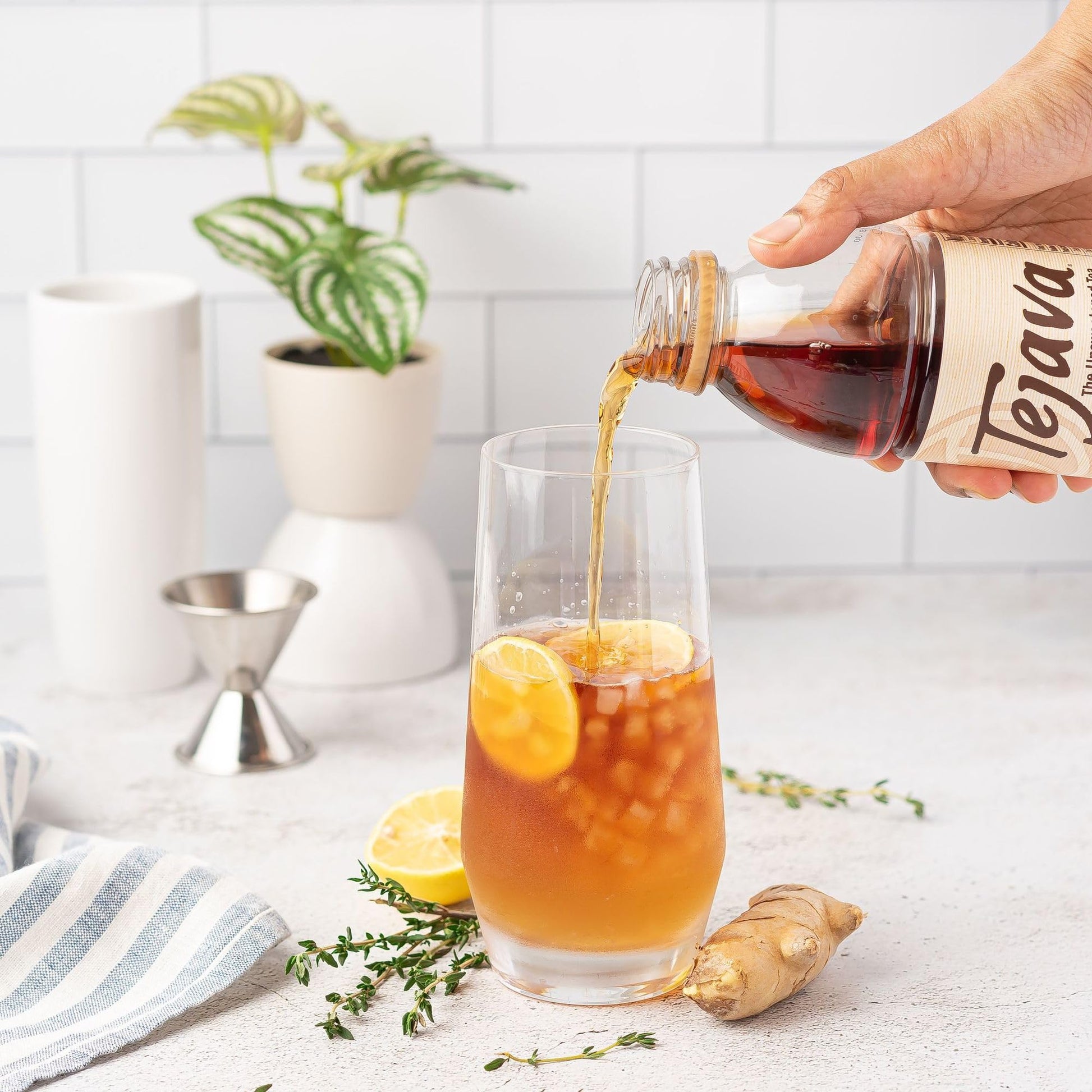 Q: What are the main ingredients in Tejava Lemon Black Iced Tea?A: Tejava Lemon Black Iced Tea is made from brewed tea using select Java tea leaves and water, along with natural lemon flavors. It contains no sugar, sweeteners, or preservatives, making it a pure and refreshing beverage.