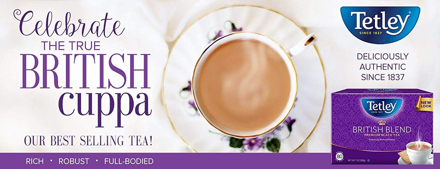 Q: What makes Tetley British Blend Premium Black tea unique?A: Tetley British Blend Premium Black tea is crafted from a rich blend of Kenyan and Assam teas, providing a full-bodied and invigorating flavor that is perfect for an authentic English breakfast experience.