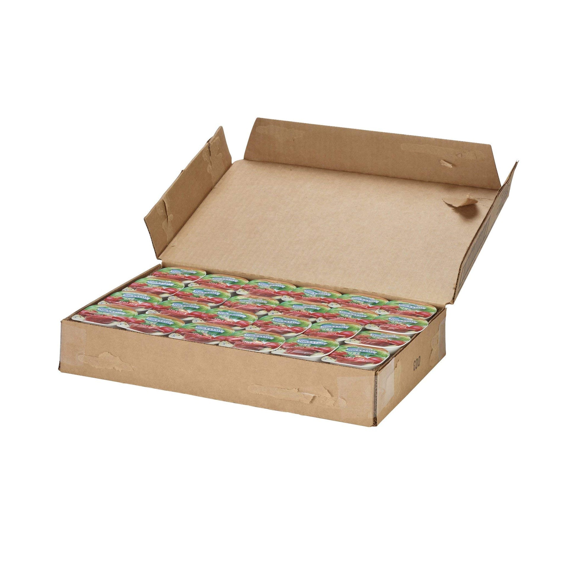 - Q: How is Thick & Easy Clear Thickened Apple Juice served? A: This thickened juice is available in convenient 4-ounce cups or multi-serving 48-ounce bottles. Simply chill the product, pour it into a glass, and enjoy its honey consistency.