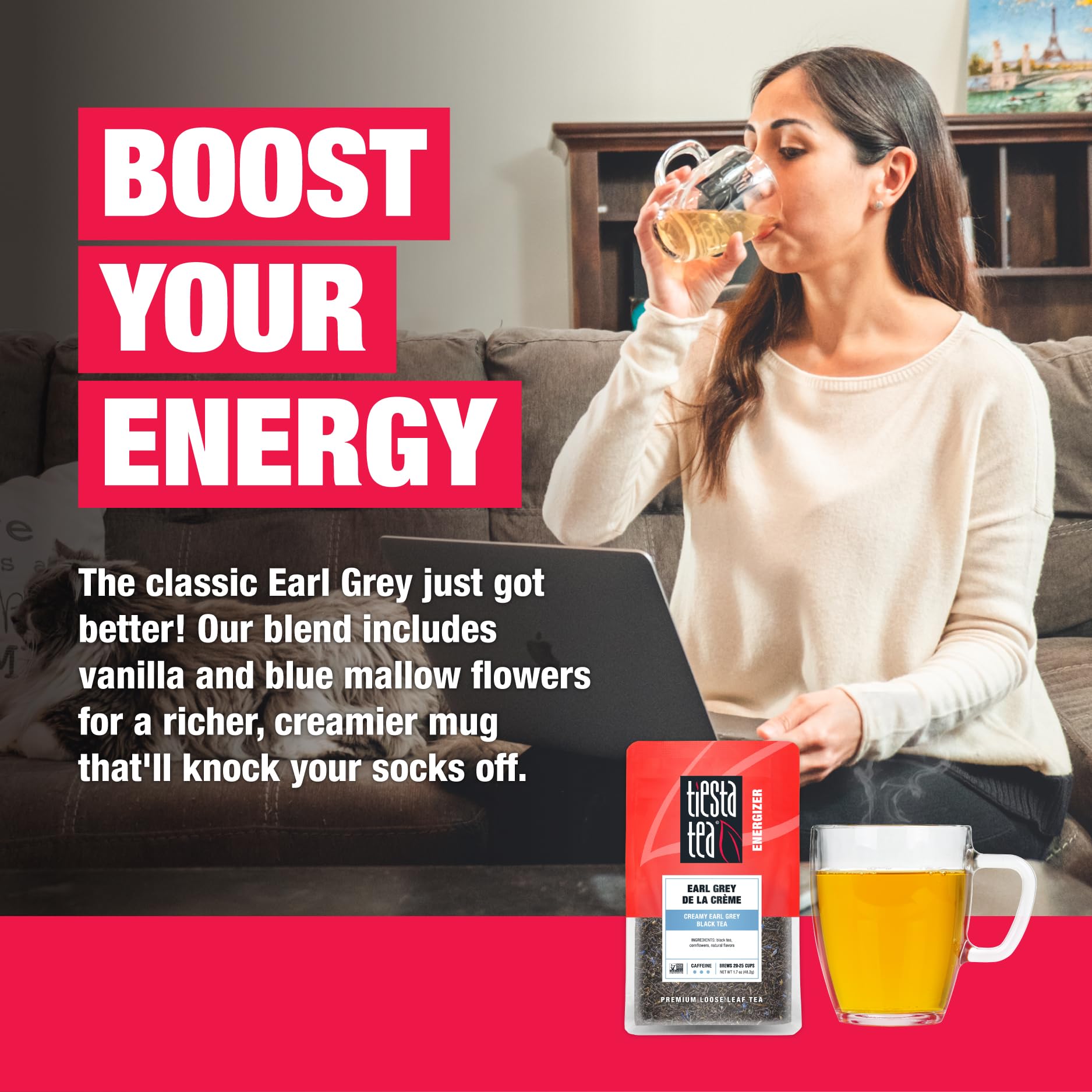 CREAMY EARL GREY PERFECTION: Discover the exquisite harmony of our Creamy Earl Grey Black Tea, a luscious twist on the classic favorite. We've woven the elegance of vanilla and the charm of blue mallow flowers into this brew to keep your mind sharp and fog-free. Whether you prefer it piping hot or iced, plain or with a splash of milk and a hint of sugar, this tea offers pure indulgence. | PREMIUM LOOSE LEAF TEA BLEND: Elevate your tea ritual with our meticulously crafted premium loose leaf blend. We've carefully sourced the finest natural ingredients, including premium black tea, cornflowers, and natural flavors, to awaken your senses. As you bid farewell to disposable tea bags, you'll embrace the opulent richness that's visible in the vibrant tea leaves, aromatic in its scent, and truly savored in each cup. | REUSABLE TEA POUCH FOR TEA LOVERS: Our charming and reusable pouch is the perfect gift for tea enthusiasts. Offering airtight storage, it ensures that your earl grey loose leaf tea remains cozy and fresh for 20-25 cups. Not only a functional addition to your tea collection, but it also sits beautifully on your countertop, a testament to your passion for fine teas. | EFFORTLESS BREWING: Enjoy a hassle-free brewing experience with our earl grey loose leaf tea. Simply scoop 1.5 tsp of this delightful loose leaf tea blend for every 8 oz of hot water at 195 degrees Fahrenheit. Allow it to steep for 3-5 minutes to release the full spectrum of flavors. Then, savor the moment as you remove the tea leaves and indulge in your perfectly steeped cup. It's the ideal way to appreciate the rich and aromatic notes of our premium blend. | LIVE LOOSE + OUR IMPACT: We don’t take ourselves too seriously, but we seriously love to give back; through the Tiesta Tea Foundation, we provide resources and relief to communities across the globe and in our own backyard; so join us and Live Loose!