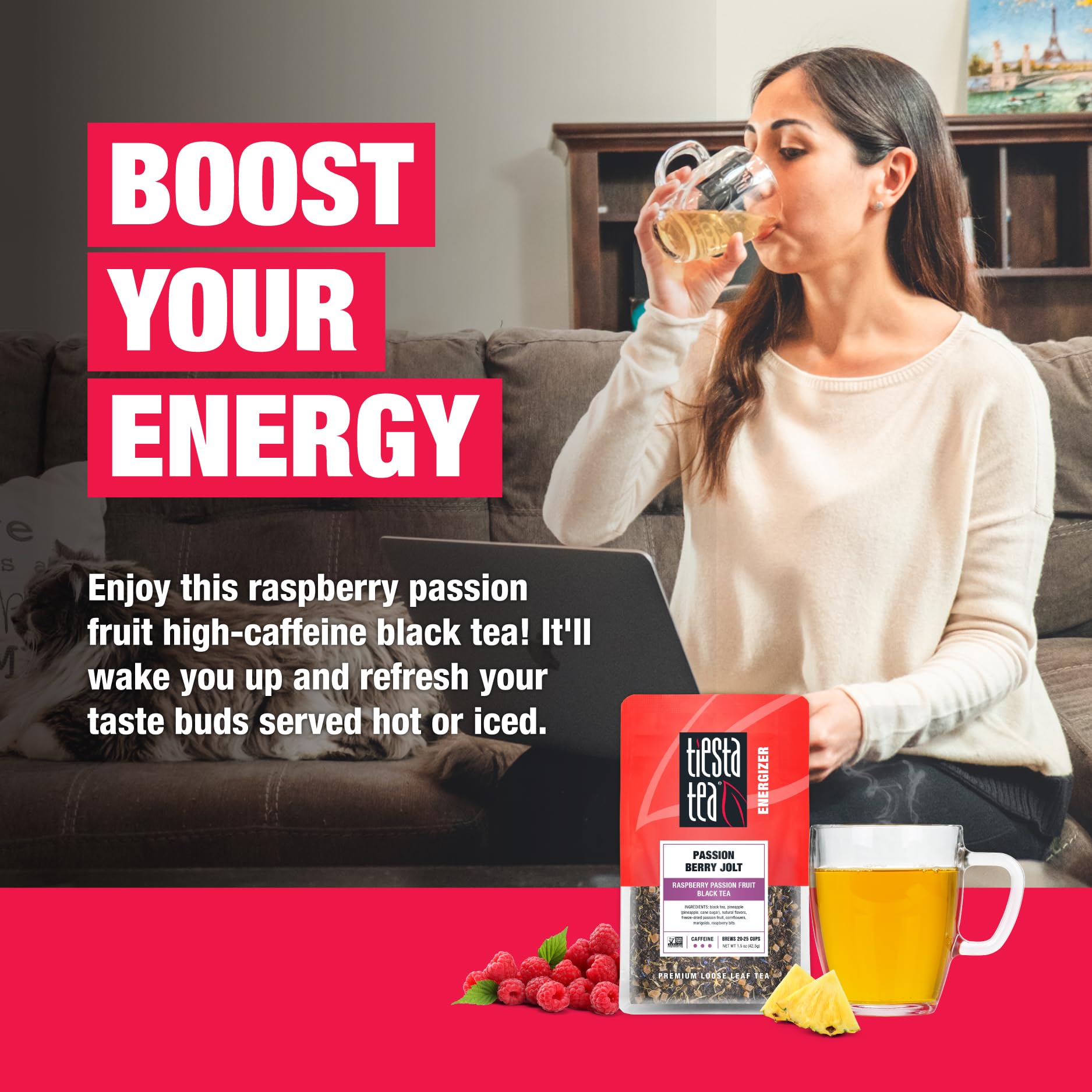 Q: What are the key ingredients in Tiesta Tea's Passion Berry Jolt?A: Tiesta Tea's Passion Berry Jolt features a blend of premium black tea, raspberry, and passion fruit flavors, along with natural ingredients like cornflowers to create a vibrant and energizing tea experience.