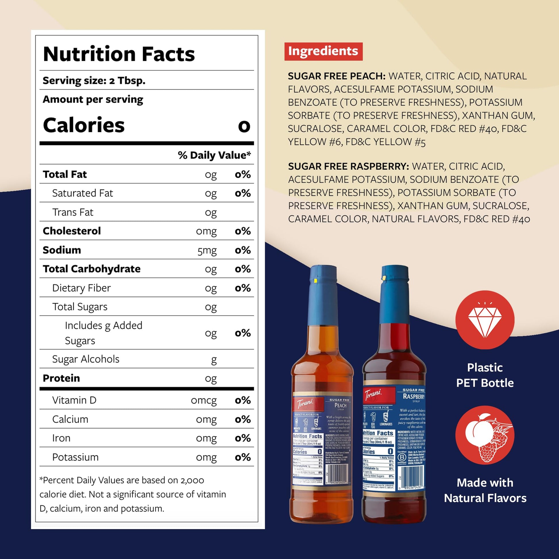 Q: What are the main flavors in the Torani Sugar Free Raspberry Syrup and Sugar Free Peach Syrup Variety 2-Pack?A: The Torani Sugar Free Raspberry Syrup and Sugar Free Peach Syrup Variety 2-Pack includes two delicious flavors: raspberry and peach. Both syrups are sugar-free and perfect for adding a fruity twist to drinks and desserts.