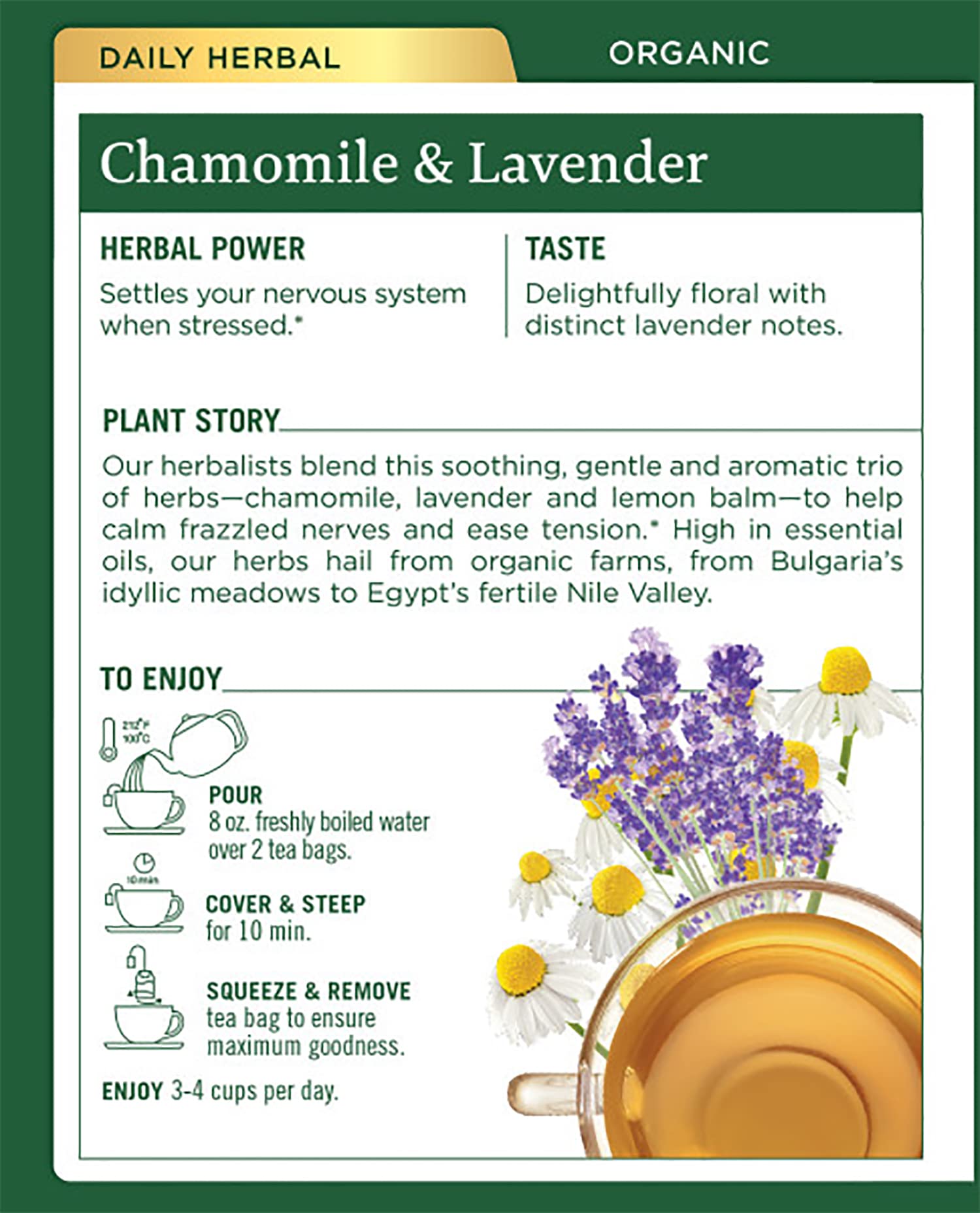 - Q: How should I prepare Traditional Medicinals Organic Chamomile & Lavender Herbal Tea for the best flavor? A: For the best flavor, steep one tea bag of Traditional Medicinals Organic Chamomile & Lavender Herbal Tea in boiling water for 5 to 10 minutes, depending on your desired strength. You can enjoy it plain or add honey for a touch of sweetness.