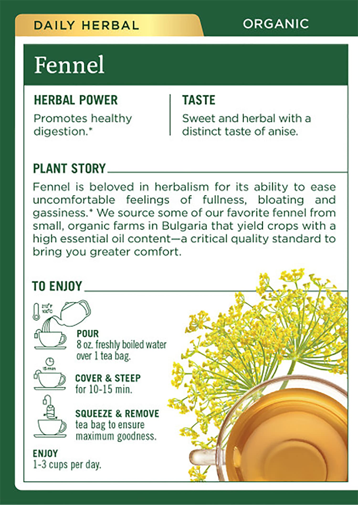 Fennel is beloved in herbalism for its ability to ease uncomfortable feelings of fullness, bloating and gassiness. We source some of our favorite fennel from small, organic farms in Bulgaria that yield crops with a high essential oil content-a critical quality standard to bring you greater comfort.