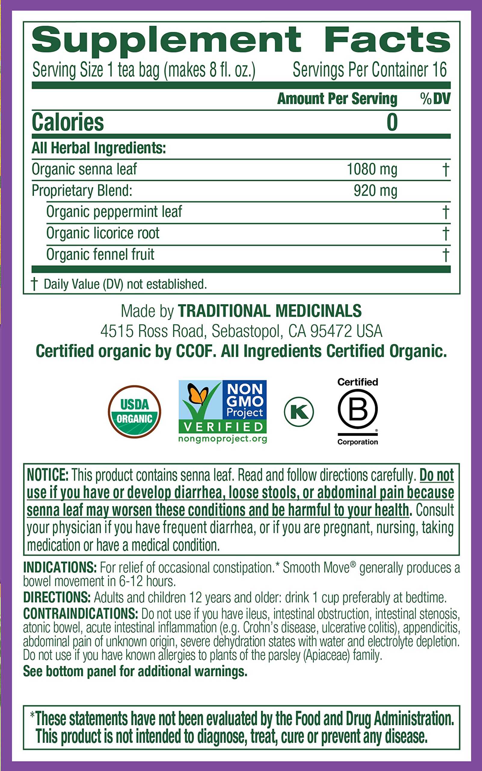 View compareTraditional Medicinals Tea, Organic Smooth Move Peppermint, Relieves Occasional Constipation, Senna, 16 Tea Bags