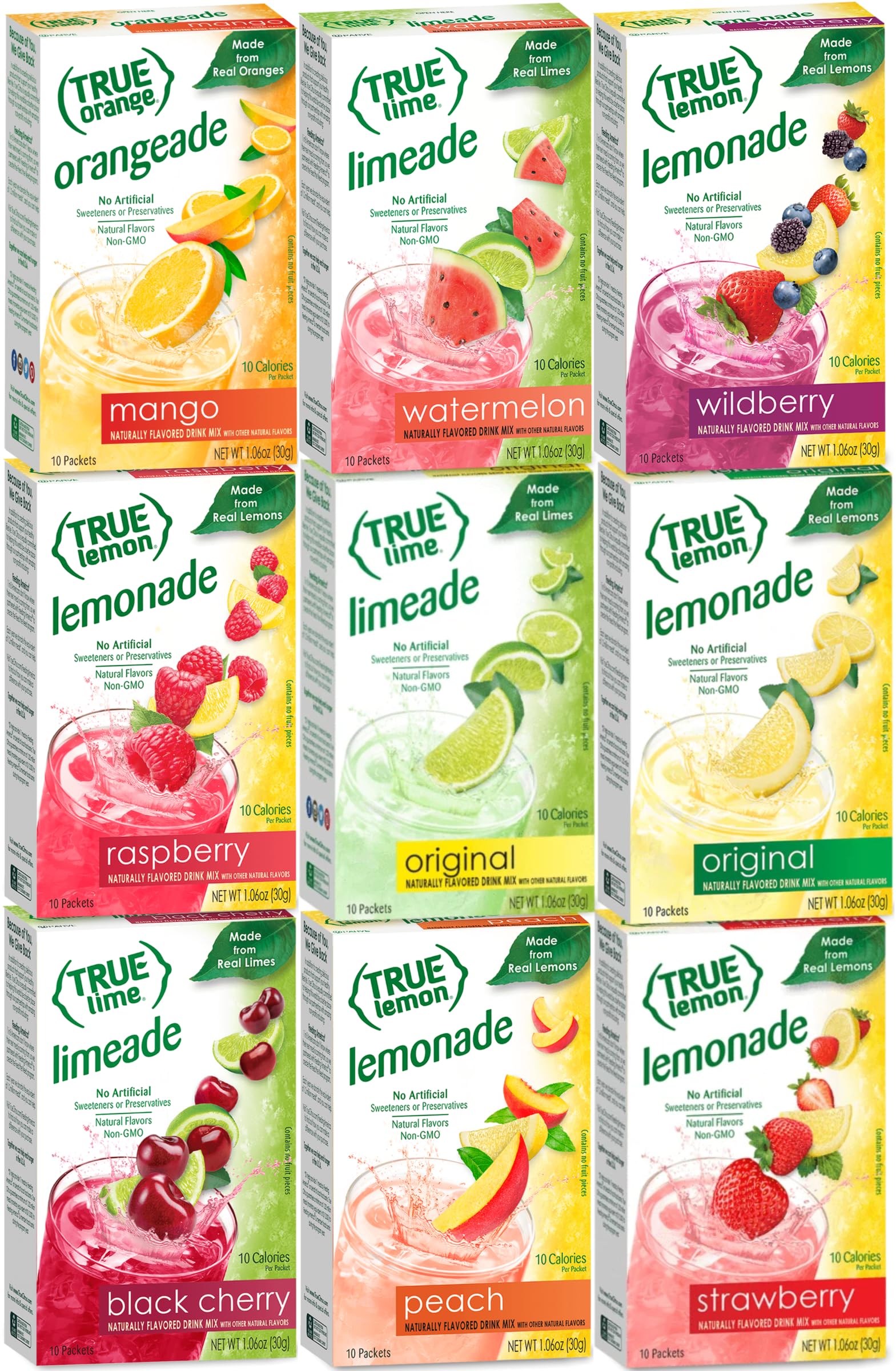 True Lemon STRAWBERRY, WILDBERRY, LIMEADE, WATERMELON, BLACK CHERRY, MANGO ORANGE, PEACH, LEMONADE, RASPBERRY (Pack of 9) 10ct each box. True Citrus Sample Kit of Lemonade and Limeade.
