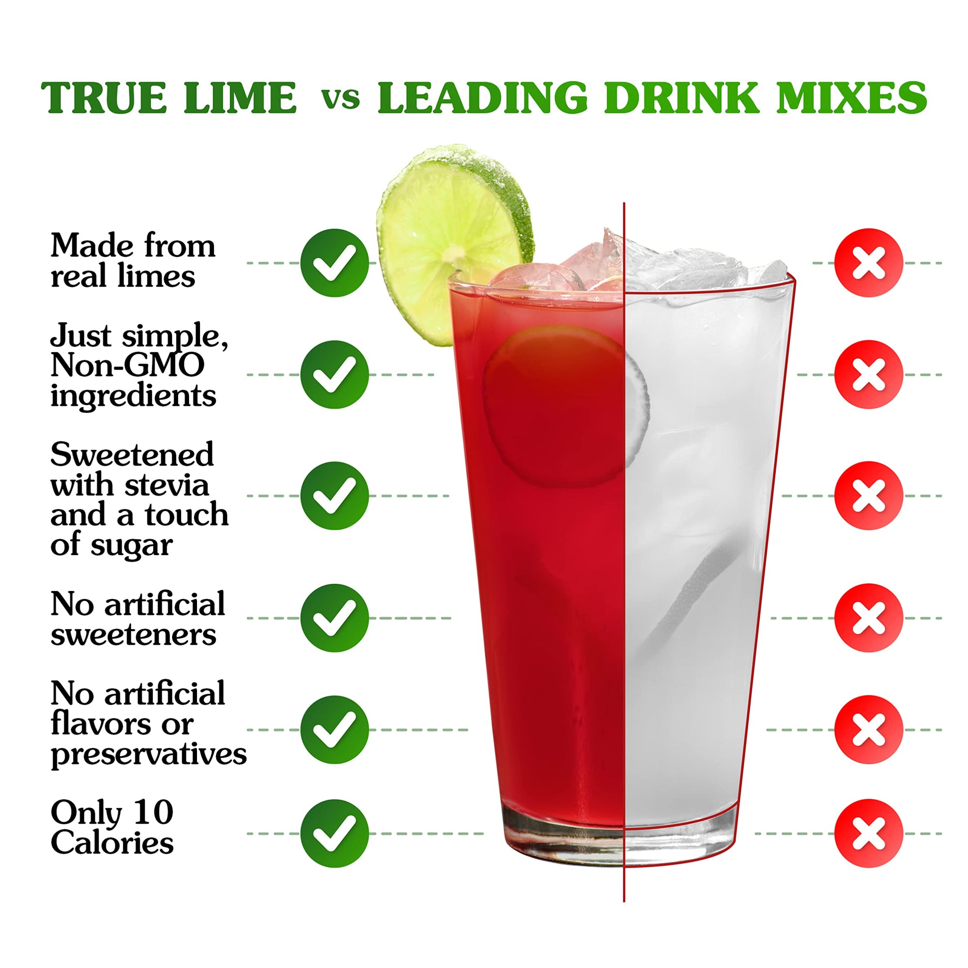 Q: What are the main ingredients in TRUE LIME Black Cherry Limeade Drink Mix?A: TRUE LIME Black Cherry Limeade Drink Mix is made from real lime juice and oils, naturally sweetened with stevia, and contains no artificial sweeteners, preservatives, or colors from artificial sources.