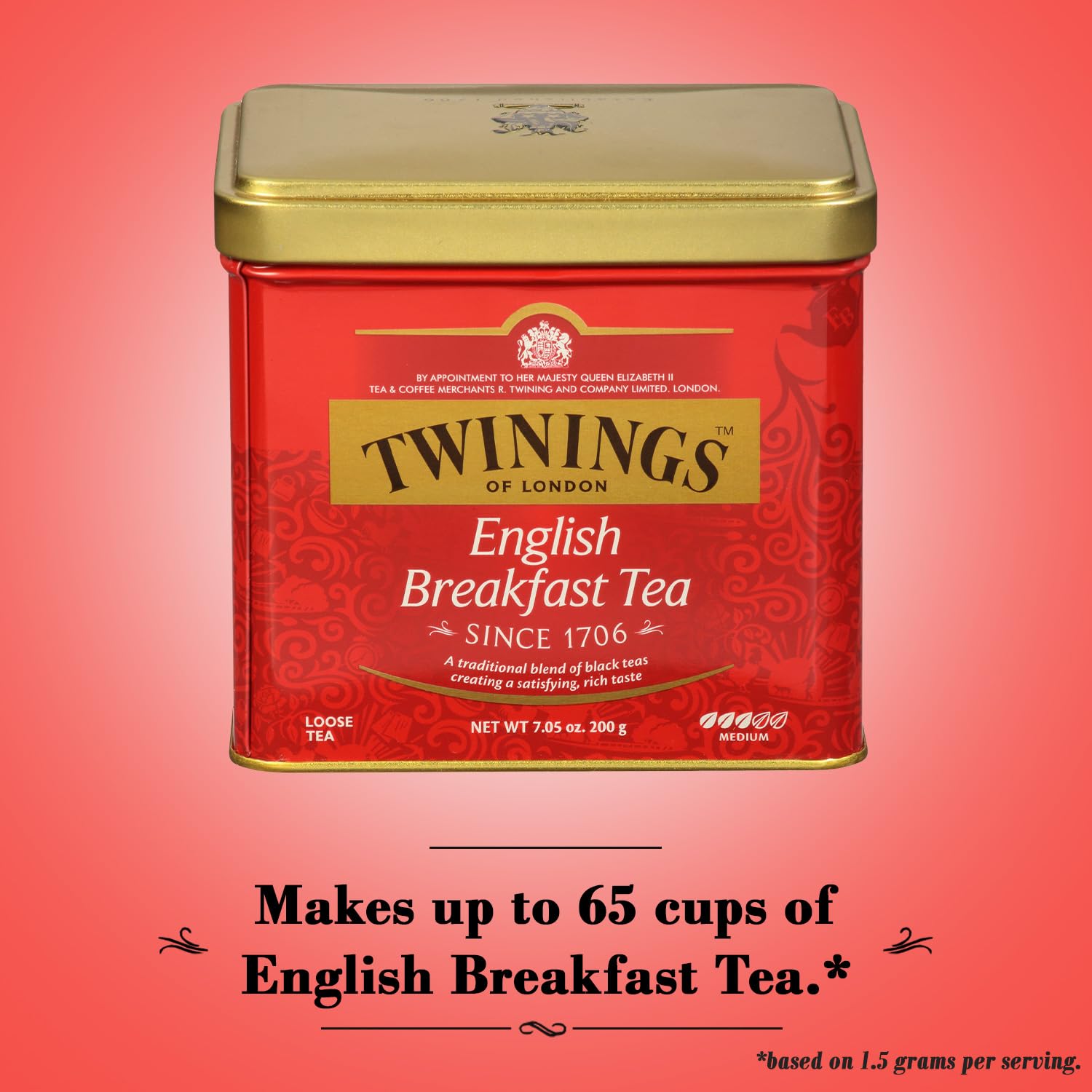 CLASSIC BLACK TEA: Fresh, fragrant and flavoured with distinctive notes of citrus and bergamot, this English Breakfast tea has all the taste of the original; Caffeinated, 7.05 ounce loose leaf black tea in a metal tin, Pack of 6 | ONLY THE FINEST QUALITY: Loose black tea brilliantly blended by our Master Blenders to maximize flavour. In 1831 we created Earl Grey in our shop on the Strand at the request of the Prime Minister. He loved it so much he gave his name to it. Before long it had taken London by storm and it is still a favourite amongst people who like things with a twist, who travel off the beaten track and don't always play by the rules. | SIP & SAVOUR THE MOMENT: Use 1 rounded teaspoon per serving to measure out tea. Next, add 8 oz of freshly boiled water and allow to steep for 3 to 4 minutes for the perfect flavour. Lastly, enjoy black, with milk and sugar if preferred. | DRINK IN LIFE: With a signature blend of tradition and innovation, Twinings encourages tea lovers to "Drink In Life" by taking small steps towards feeling good and living well, one sip at a time | SOURCED WITH CARE: Twinings aims to improve the lives of communities from which we source by improving access to water and sanitation, empowering women, and enhancing incomes and resilience.
