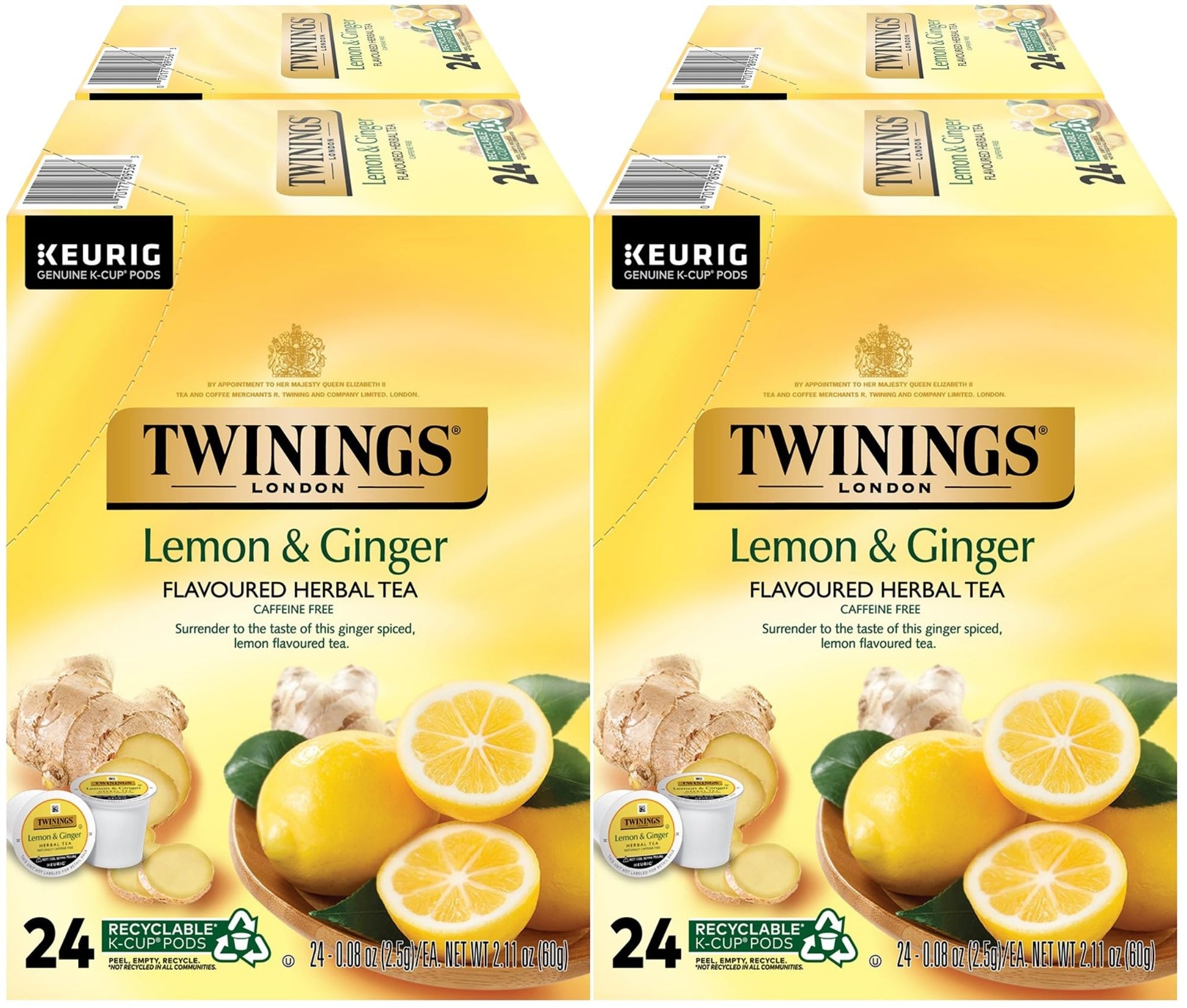 Q: What are Twinings Lemon & Ginger Herbal Tea K-Cup Pods made from?A: Twinings Lemon & Ginger Herbal Tea K-Cup Pods are made with a blend of spicy ginger and the tangy flavor of lemon, providing a soothing and aromatic herbal tea experience.
