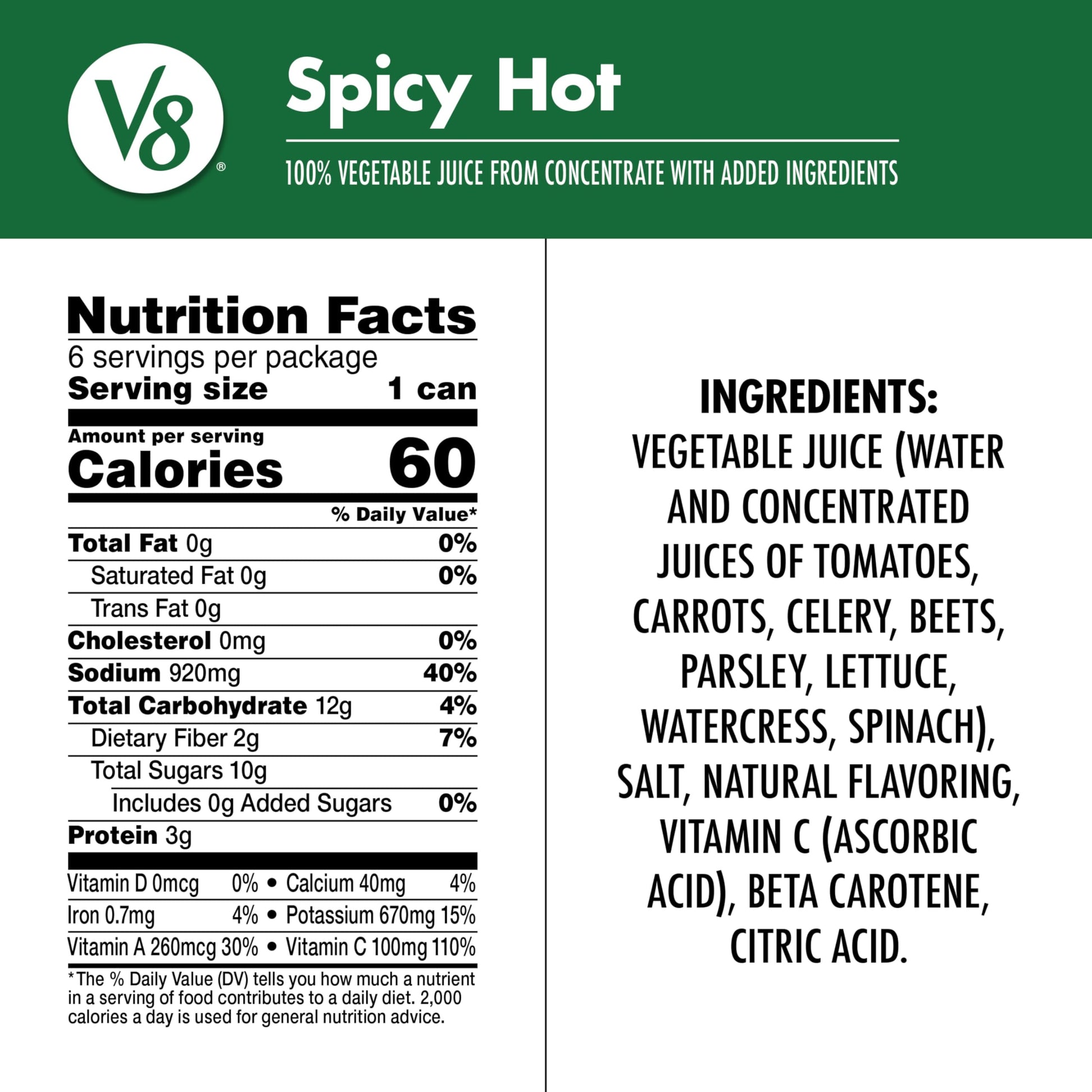 - Q: What are the main ingredients in V8 Spicy Hot 100% Vegetable Juice? A: V8 Spicy Hot 100% Vegetable Juice is made with concentrated tomato juice and the juices of seven other vegetables, offering a rich and savory flavor with a spicy kick.
