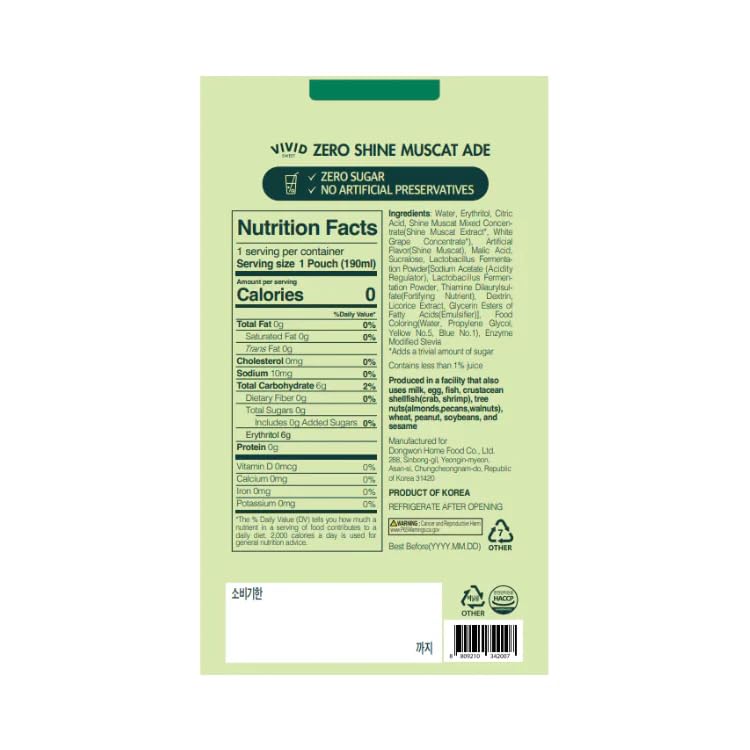 Stay Refreshed With Vivid Kitchen Korean Grape Ade - Shine Muscat Flavor, A Light And Fruity Zero-Calorie Drink That Blends Convenience With Clean Hydration. Inspired By Koreas Beloved Convenience Store Beverages, This Ade Delivers The Crisp, Refreshing Taste Of Shine Muscat Grapes In A Sugar-Free, Zero-Calorie Format-Perfect For Health-Conscious Consumers And Fitness Enthusiasts Alike. Each 6.4 Fl Oz Pouch Is Free From Artificial Preservatives, Added Sugars, And Corn Syrup, Making It A Naturally Better Alternative To Traditional Fruit Drinks. Sweetened With Erythritol, A Low-Glycemic Sweetener, This Drink Supports Minimal Sugar Absorption And Aligns With Fda Regulations For Zero Sugar And Calorie Labeling. Whether You'Re Heading To The Gym, Hiking, Or Just Staying Hydrated On A Busy Day, This Pack Of 10 Pouches Offers Convenient, Grab-And-Go Hydration With Clean Ingredients And Refreshing Flavor. Vivid Kitchen Zero Shine Muscat Grape Ade Helps You Sip Smart, Stay Fit, And Feel Good-Anytime, Anywhere.