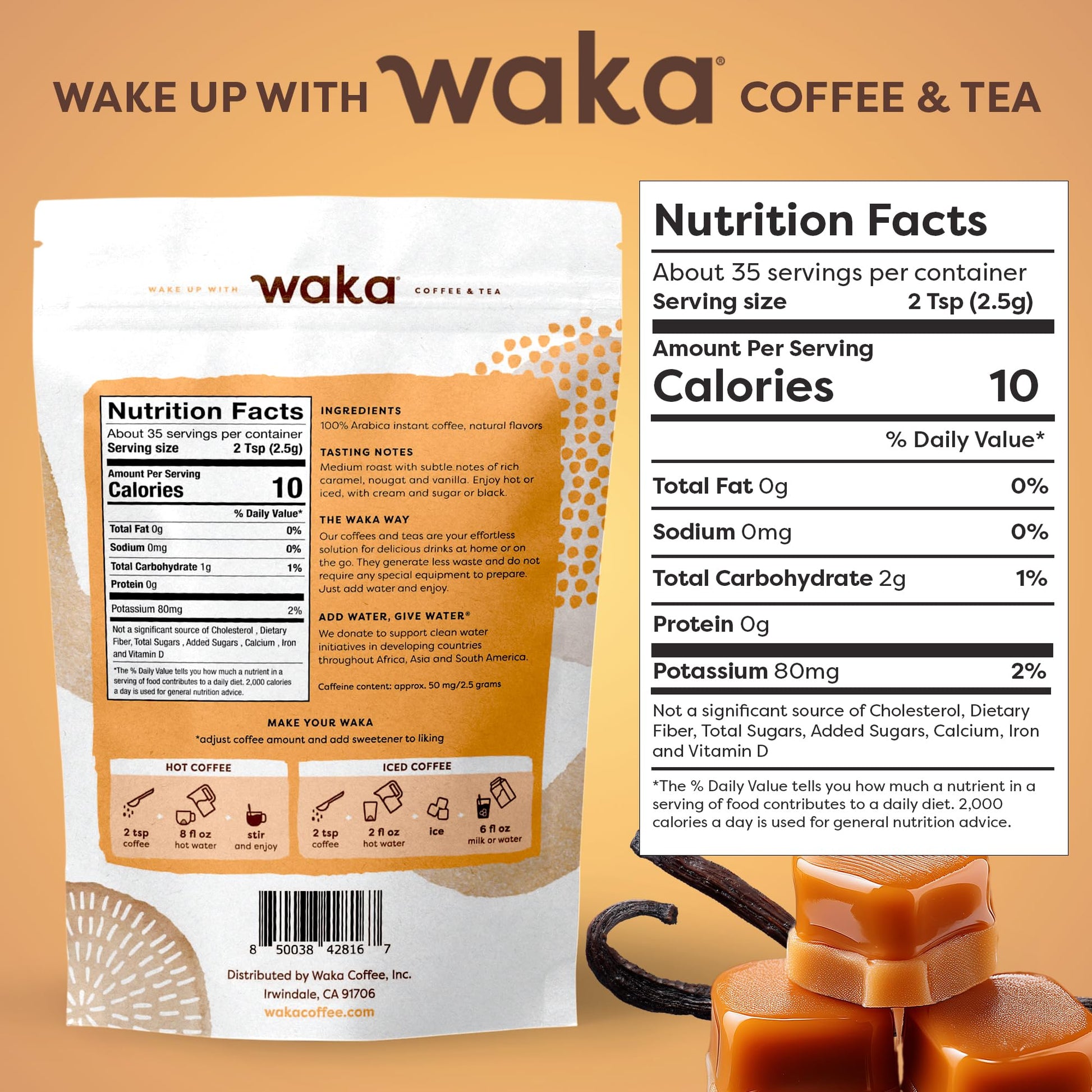 Q: What flavor notes can I expect from Waka Instant Coffee?A: Waka Instant Coffee features a medium roast with delicious flavor notes of rich caramel and nougat, providing a pleasant taste without being overpowering.