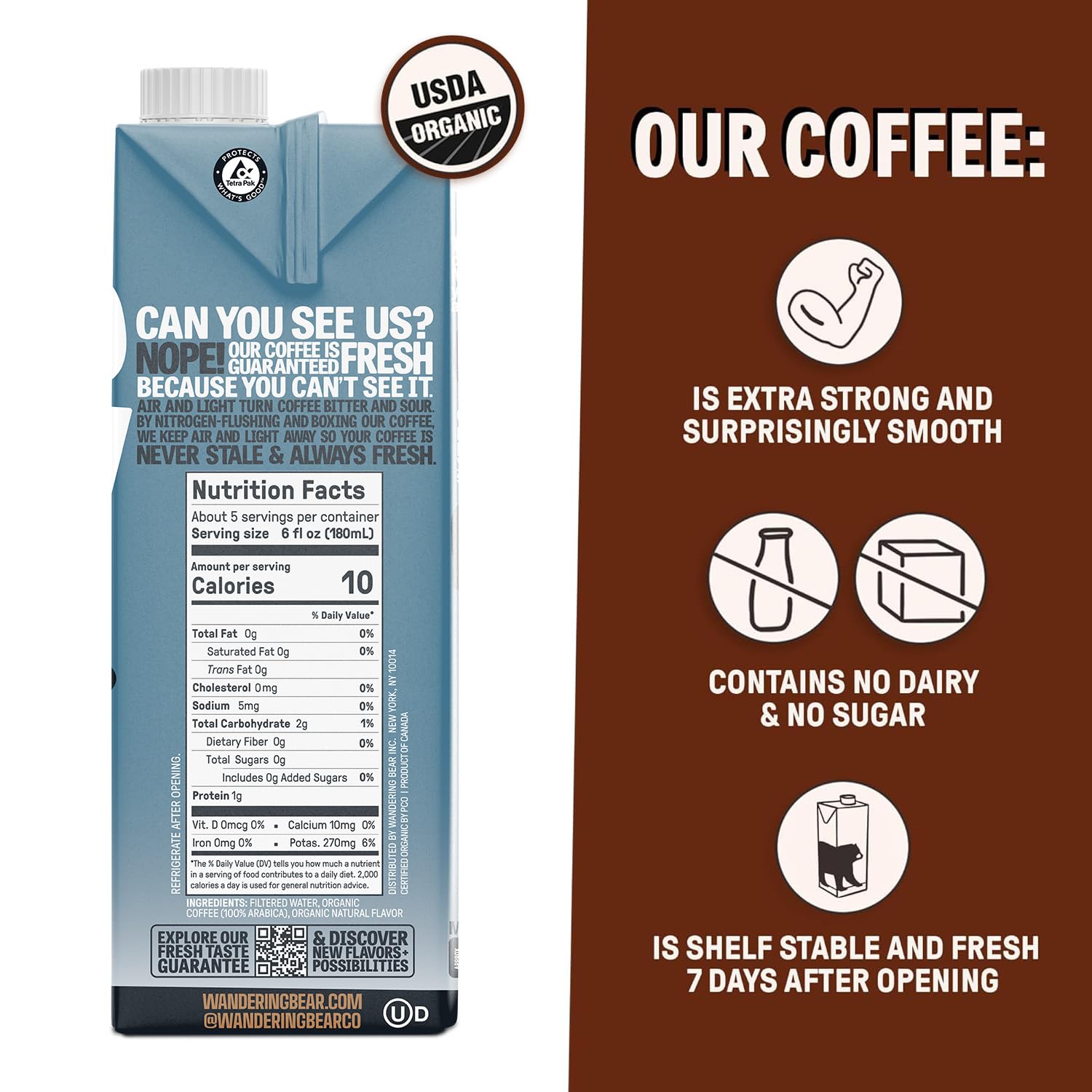 - Q: Is Wandering Bear cold brew coffee organic and free from additives? A: Yes, Wandering Bear cold brew coffee is made from organic Arabica coffee beans, filtered water, and organic natural flavor, making it a clean-label beverage without sugar, dairy, or unnecessary additives.