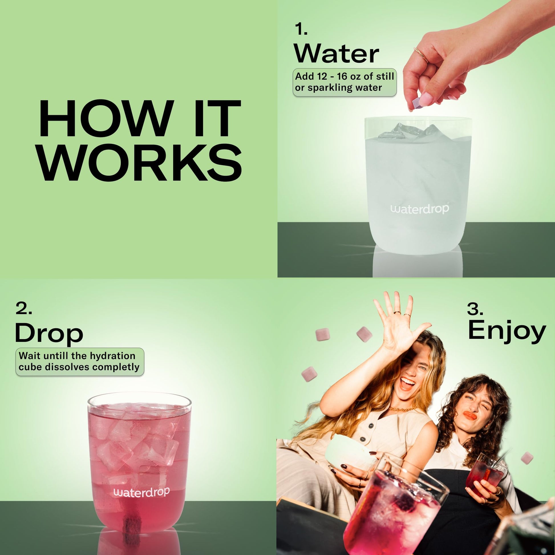 - Q: How do I use the Waterdrop Hydration Cubes? A: To use the Waterdrop Hydration Cubes, simply drop one cube into 14-20 fluid ounces of water. The cube will dissolve quickly, transforming your plain water into a flavored drink that is both tasty and hydrating.