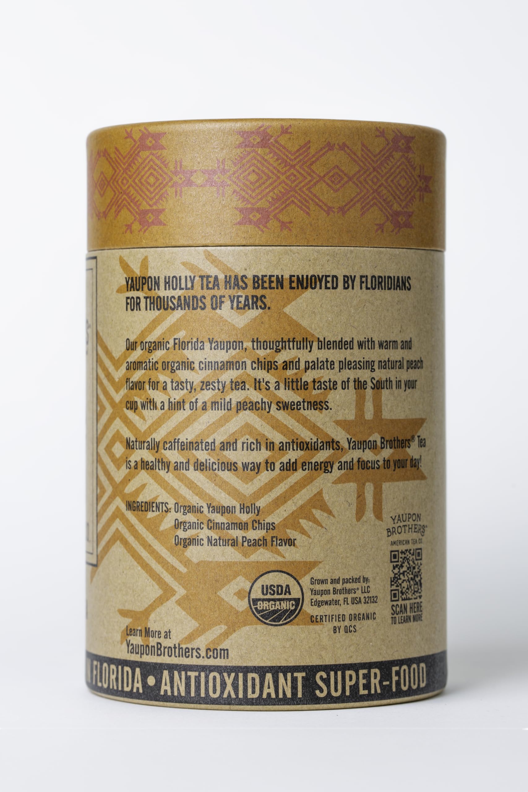 Q: What are the main ingredients in Yaupon Brothers Spiced Peach Yaupon Tea?A: Yaupon Brothers Spiced Peach Yaupon Tea is crafted from organic peach green tea, locally sourced peaches, ginger, and a blend of aromatic spices, ensuring a rich and flavorful experience.