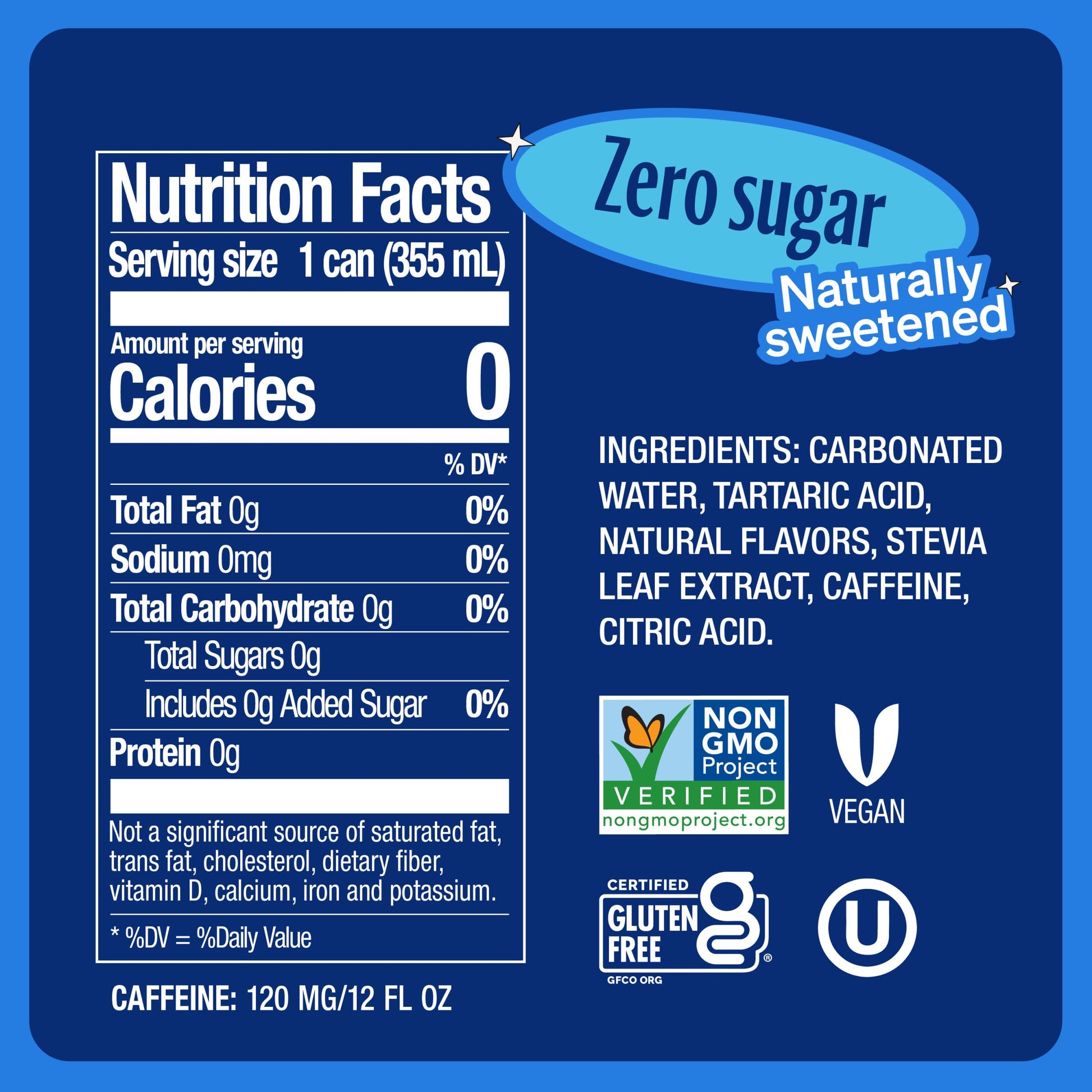 Q: What ingredients are in Zevia Zero Calorie Energy Drink?A: Zevia Zero Calorie Energy Drink is made from real, plant-based ingredients, ensuring it is Non-GMO Project Verified, gluten-free, Kosher, and vegan. It contains no added colors, artificial sweeteners, or sodium.