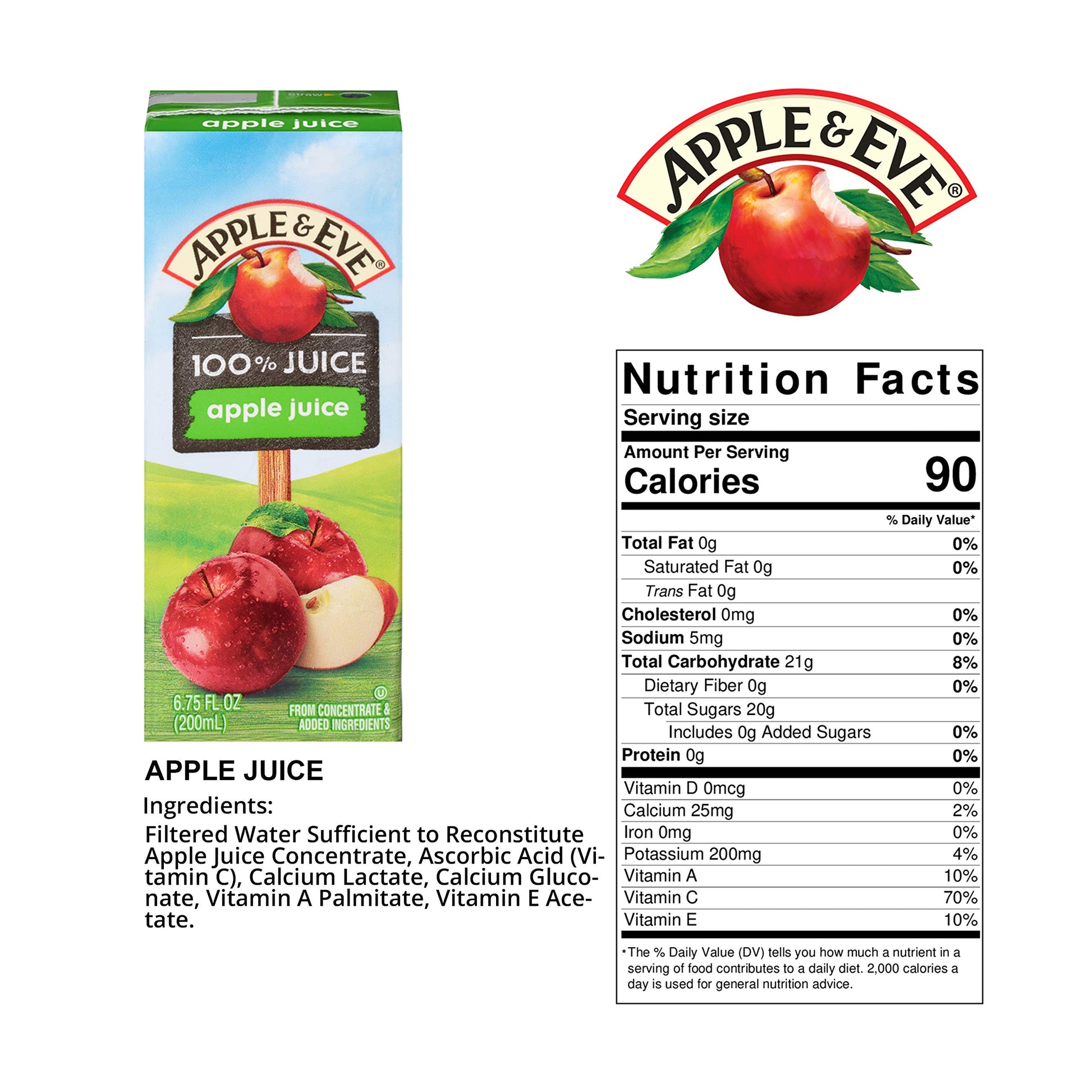 Whether you're at home or on the go, Apple & Eve 100% Juice Apple is the healthy choice for taste and convenience. The wonderful flavor of apple is rich in vitamin C, calcium fortified, and without added sugars. Perfect for homes, lunchboxes, restarants, and cafes; Apple & Eve 100% Juice Apple is a healthy and tasty juice for any environment. And there's even better news: research has shown that apples and apple juice can sharpen mental acuity, prevent asthma, and may hold an assortment of other health benefits. So you can drink to your good heath with every glass of 100% Apple & Eve Apple Juice. Starting in 1975 with the hope of providing families across America with healthier better-for-you juices, Apple & Eve continues to be proud and humbled to be invited into the homes of millions of families and serve our pure and delicious juices.