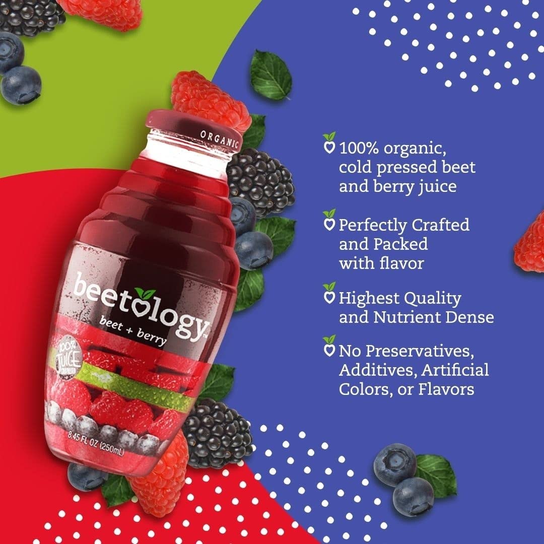 - Q: What are the main ingredients in Beetology Organic Beet & Berry Juice? A: Beetology Organic Beet & Berry Juice is made from 100% organic ingredients, including cold-pressed beets, strawberries, raspberries, and bilberries. This blend ensures a nutrient-packed beverage that is both delicious and heart-healthy.