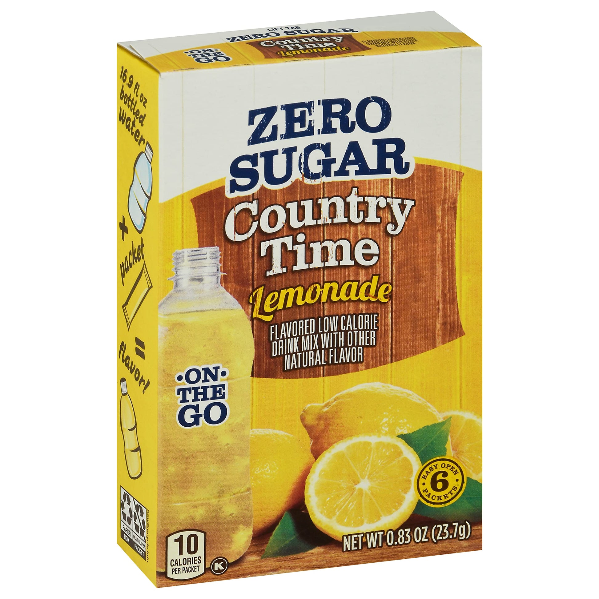 - Q: What is Country Time Zero Sugar Lemonade Powdered Drink Mix? A: Country Time Zero Sugar Lemonade Powdered Drink Mix is a sugar-free, naturally flavored lemonade mix that comes in convenient on-the-go packets. Each packet makes a refreshing lemonade beverage by simply mixing with water.
