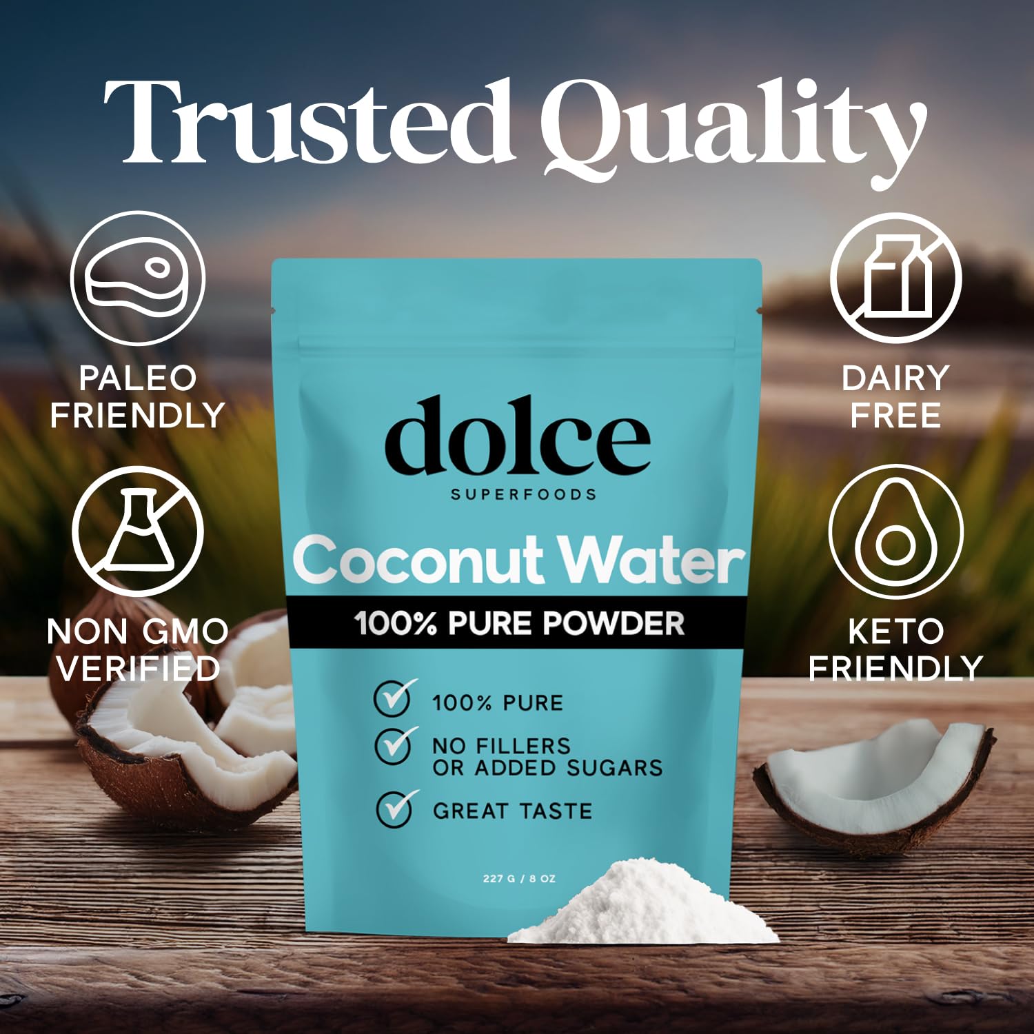 You care about what goes into your body, and so do we. At Dolce Superfoods, we believe in keeping it clean, natural, and intentional. Our Coconut Water Powder is crafted from the nectar of young coconuts, pure, simple, and packed with real goodness. No additives. No preservatives. Just smooth coconut flavor that tastes like it was cracked open moments ago. This shelf-stable coconut powder drink mix delivers essential electrolytes like potassium, sodium, and magnesium to support hydration, balance, and energy without added sugars or synthetic ingredients. Whether youre heading to yoga, spending the afternoon hiking, or simply replenishing after a long day, this powder mixes instantly into cold water for a refreshing drink that feels like a tropical escape. Its not just for sipping. Stir this natural electrolyte powder into smoothies, tropical cocktails, baked treats, or even savory dishes for a subtle coconut essence that elevates your kitchen game. An alternative to coconut water packets, our powder is lightweight, mess-free, and fits neatly into your daily routine. No refrigeration, no fuss. Available in both 8 oz and 1 lb, this coconut electrolyte powder is the kind of staple youll be glad to have on hand at home, in your gym bag, or on the go. Because when hydration is this clean, convenient, and delicious, this coconut electrolyte drink becomes something youll look forward to every day. From our farmers to your glass, Dolce Superfoods is proud to bring you coconut water the way nature intended. Hydrate simply. Flavor honestly. Recharge naturally with this coconut water packets.