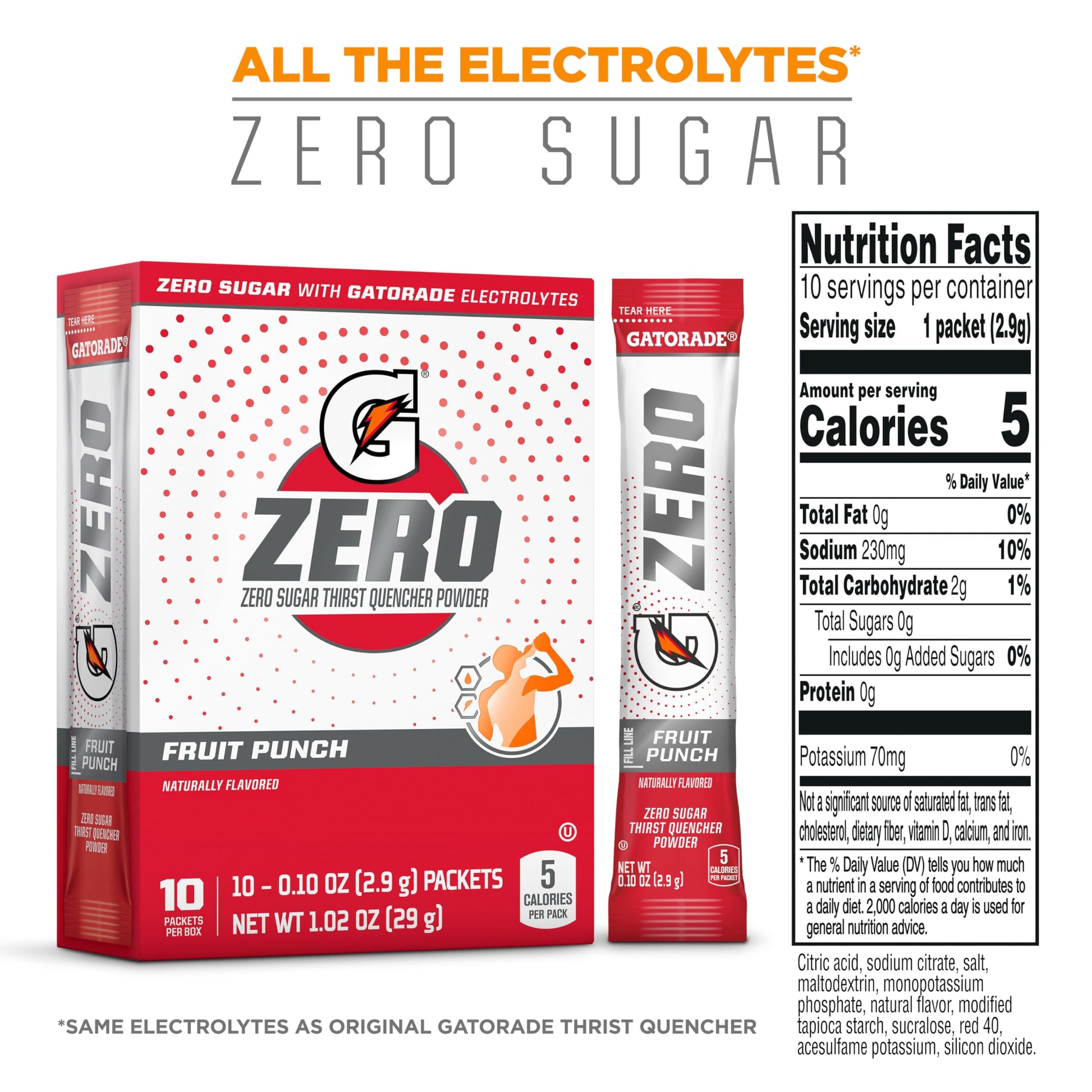 - Q: Does Gatorade G Zero Powder contain any sugar? A: No, Gatorade G Zero Powder is sugar-free while still delivering essential electrolytes, making it a great choice for those looking to hydrate without the added calories from sugar.