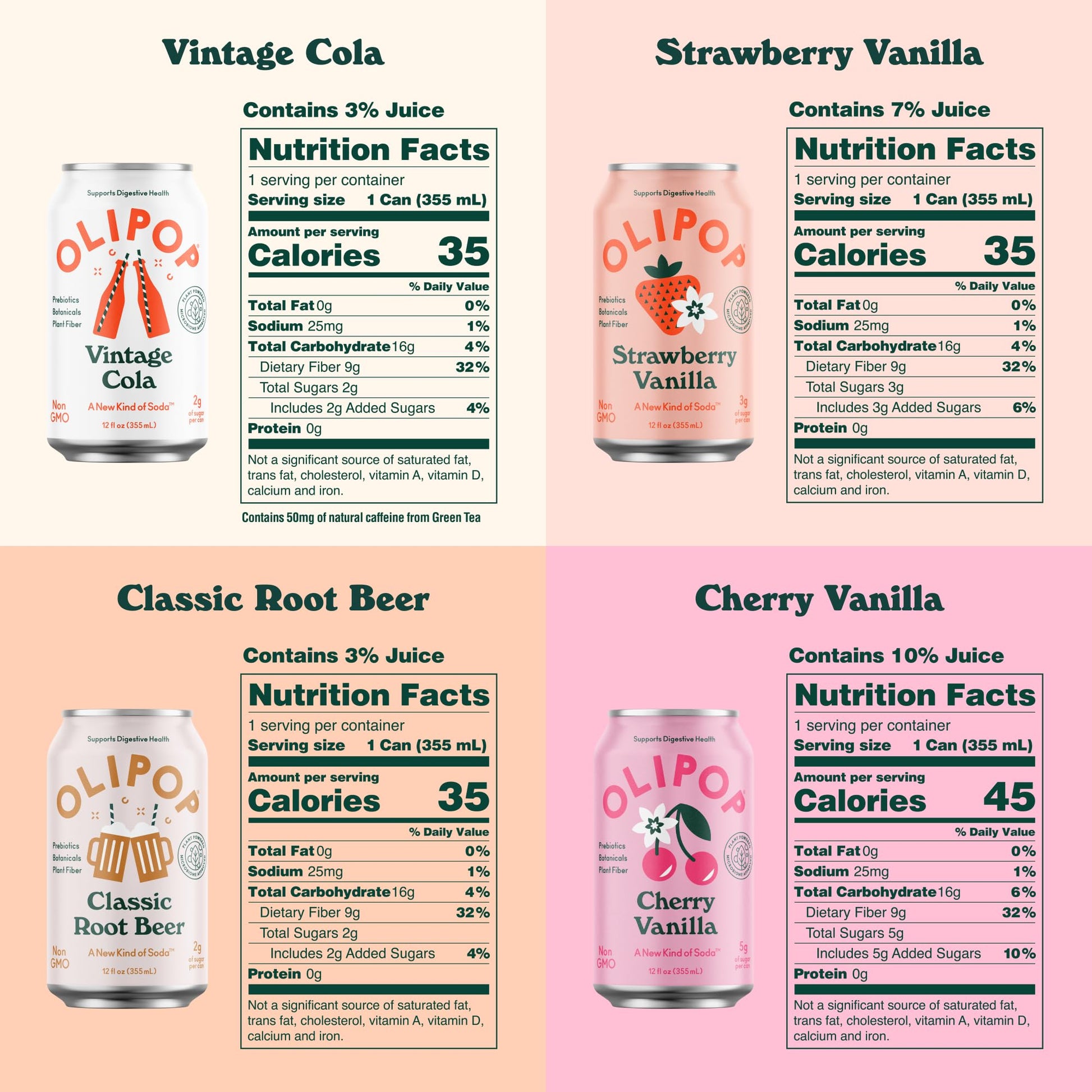 - Q: What flavors are included in the OLIPOP Sampler variety pack? A: The OLIPOP Sampler variety pack includes six delicious flavors: Vintage Cola, Classic Root Beer, Strawberry Vanilla, Orange Squeeze, Cherry Vanilla, and Ginger Lemon. Each pack contains two of each flavor, allowing you to enjoy a range of tastes.