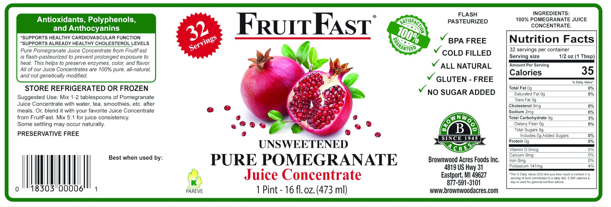 Please note that our Pomegranate Juice Concentrate varies in color depending on the time of the year and the temperature at which you store your concentrate. When shipped during the winter months, and when refrigerated at cold temperatures, it will take on a cloudy color and might form small particles on the bottom of the bottle. If you simply leave it out of the refrigerator for several hours, or put it in a warm water bath, it will change back to a dark red/purple color. The concentrate is fine to drink. This 100% Pomegranate Juice Concentrate from FruitFast puts the health benefits of cherries to work for you and Supports Healthy Cardiovascular Function* and Helps Maintain Healthy Cholesterol Levels* At Fruitfast we take care not to expose our pure Pomegranate Juice Concentrate to prolonged periods of extreme heat, instead using a careful flash pasteurization process that produces a 100% natural, tasty Pomegranate Juice Concentrate. This process also helps to preserve enzymes, color, and flavor . All of our fruit juice concentrates are 100% pure, all-natural, and not genetically modified. Pomegranate Juice Concentrate is cold-filled and cold-stored in order to preserve its natural purity. Our Fruit Juice Concentrates have NO: added sugar, fillers or preservatives and are bottled in a PET 1 plastic, BPA free and fully recyclable bottle. This 65 Brix, Non-GMO, Gluten Free Concentrate is the real deal and you can taste and see the difference. Directions: With each Quart making close to three gallons of Pomegranate Juice , just add one-half ounce of this delicious fruit juice concentrate with 5 ounces water, soda or lemonade. Fruitfast fruit concentrates must be refrigerated upon arrival and will last up to 12 months in the refrigerator and longer in the freezer! Yep, these concentrates are freezer-friendly.