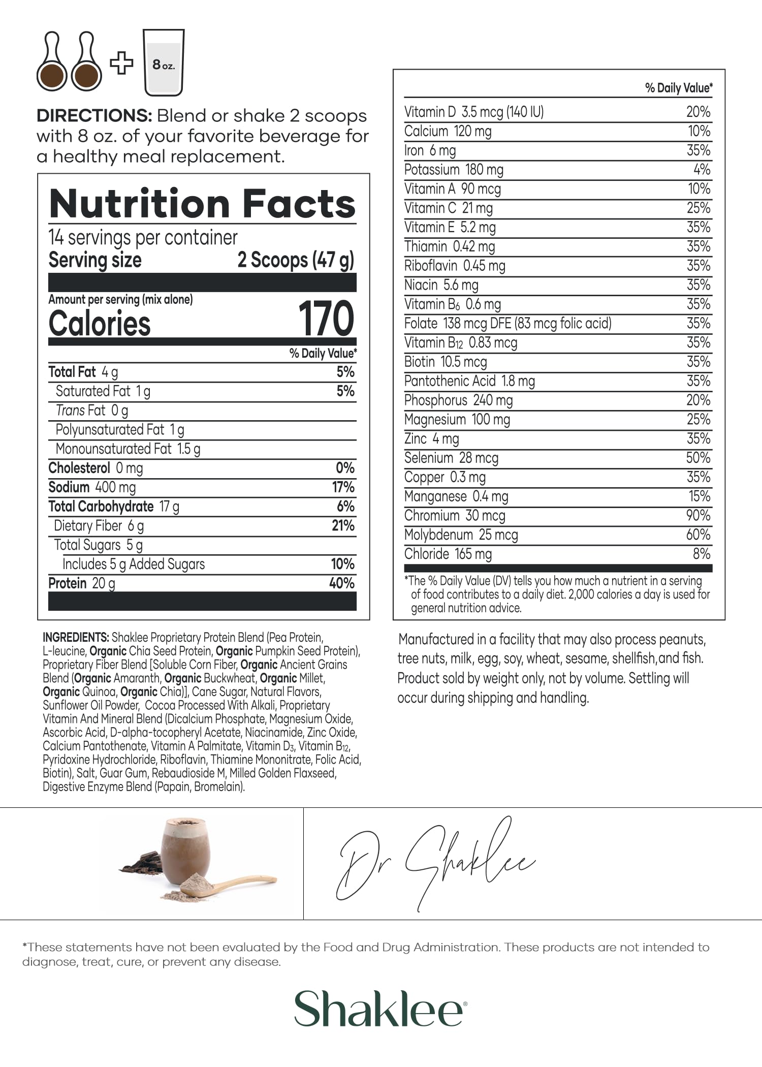 Shaklee Life Shake Plant Protein Rich Chocolate - Complete Meal Replacement with 20g Protein, 6g Fiber, 24 Vitamins & Minerals -