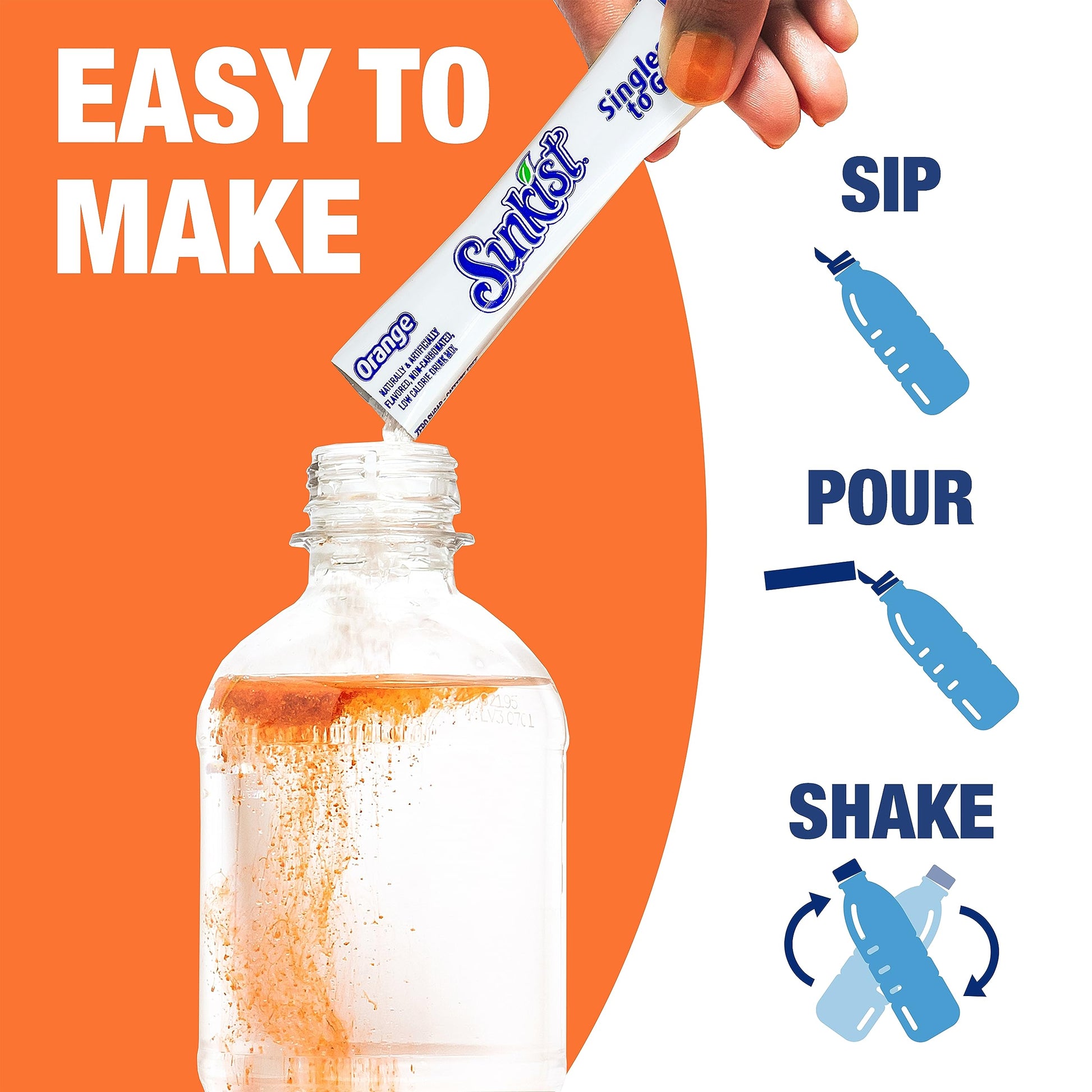- Q: How do I prepare a drink using Sunkist Soda Singles To Go? A: To prepare a drink, simply pour one packet of Sunkist Soda Singles To Go into an average-sized water bottle, shake well, and enjoy the refreshing flavor.