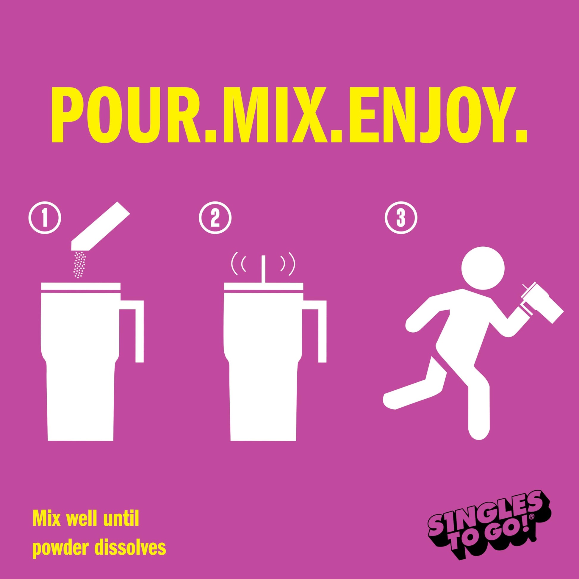 Now you can bring the taste of the rainbow with you everywhere you go Skittles Singles To Go drink mix sticks are bursting with fun fruit flavor that will add tasty excitement to your day. They are low-calorie water enhancers that have zero sugar, so you can feel great about sharing them with the whole family. To experience the exciting flavor, take a sip from a full bottle of water to make room for the powder. Pour one stick into a 16.9 fl. oz. bottle or large glass of water, shake until well mixed, and enjoy.