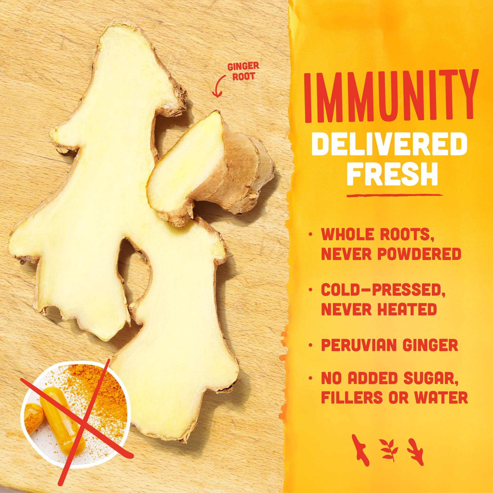 FRESH PRESSED IMMUNITY SHOTS: We use cold pressed farm fresh Peruvian ginger and Hawaiian turmeric to kickstart your day. The Ginger Shot has 40,000mg of the daily super herb ginger root along with organic cayenne pepper.