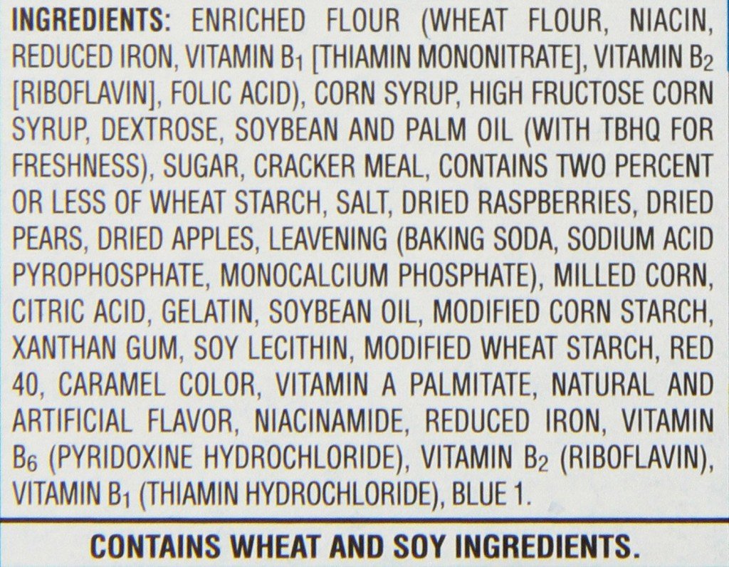 - Q: What are the main ingredients in Kellogg's Pop-Tarts Frosted Raspberry? A: Kellogg's Pop-Tarts Frosted Raspberry are made with a blend of flour, sugar, and real fruit, along with various vitamins and minerals. They are designed to provide a sweet and fruity flavor experience.