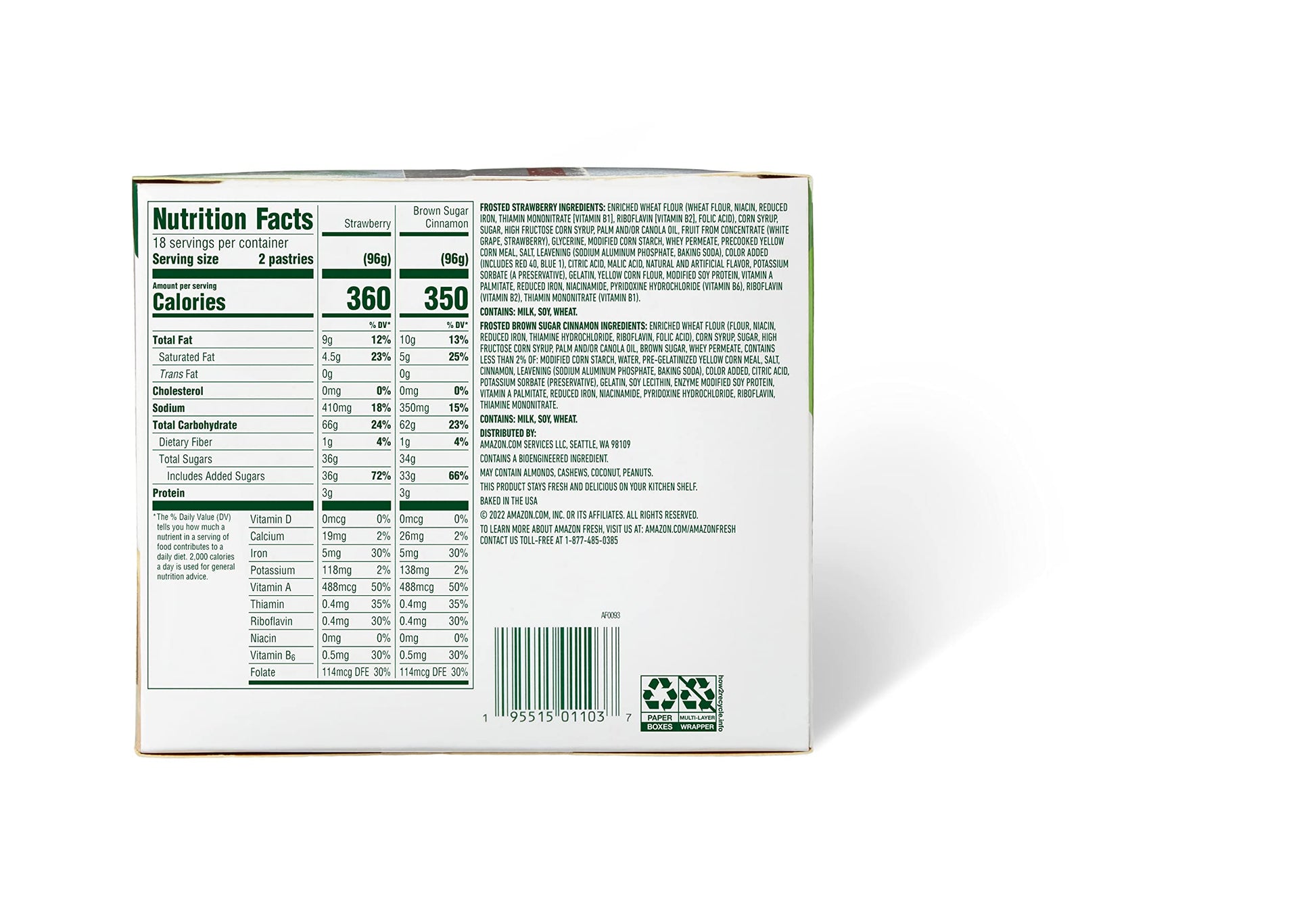 - Q: What flavors are included in the Amazon Fresh Frosted Toaster Pastries variety box? A: The Amazon Fresh Frosted Toaster Pastries variety box includes twenty-four Strawberry pastries and twelve Brown Cinnamon Sugar pastries.