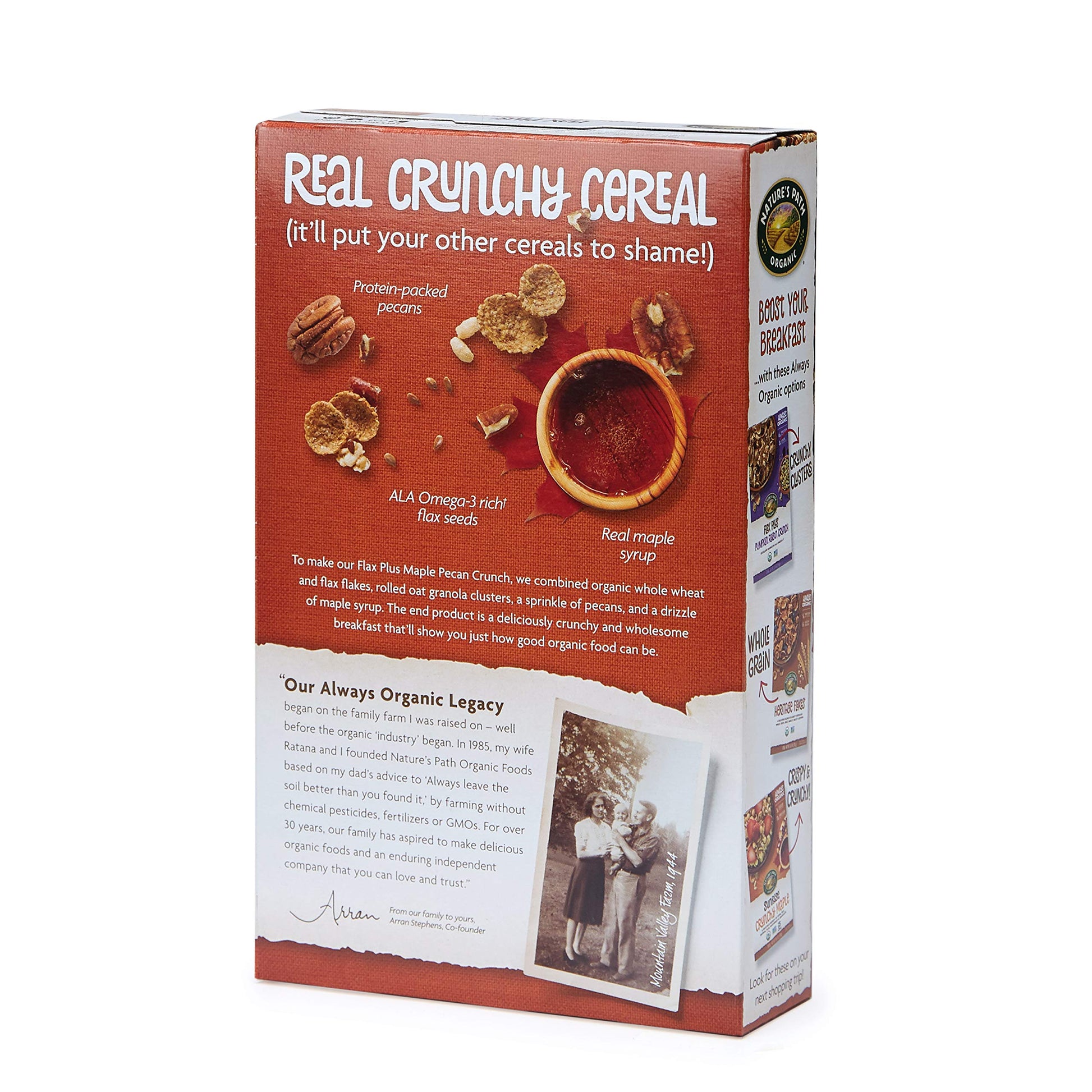 Natures Path Flax Plus Maple Pecan Crunch Cereal is crafted with whole wheat and flax flakes, toasted granola clusters, ALA Omega-3 rich flax seeds, buttery pecans, coconut, and real, organic maple syrup. This is a deliciously crunchy cereal you cant help but love. 25 grams of whole grains, 7 grams of plant protein, 5 grams of fiber, and omega-3 essential fatty acids-all in one hearty bowl. Start your morning right with tasty goodness, from simple, whole food and organic, non-GMO ingredients. At Natures Path we hold organic to an even higher standard: to build and regenerate the soil. As pioneers of the organic movement, we believe organic food and farming is the best way to care for our bodies and for the planet. We always have and always will use our voice to stand for what we believe is right, and what organic truly means. *Best Breakfast Cereals from Consumer Reports Tests, Consumer Reports, January 17, 2022