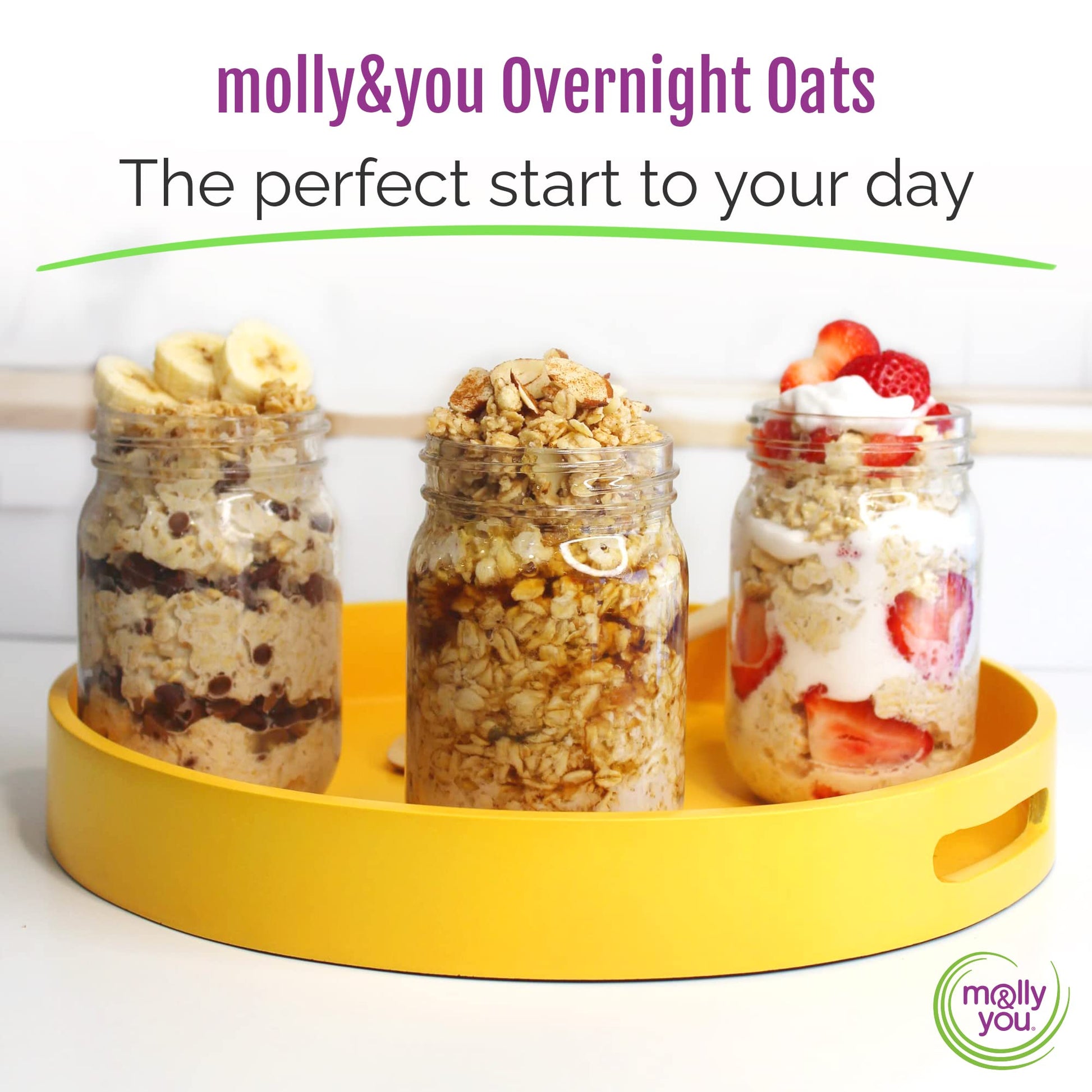 Q: What are the main ingredients in Molly & You Strawberry Shortcake Overnight Oats?A: Molly & You Strawberry Shortcake Overnight Oats are made from gluten-free oats, and they are vegan, non-GMO, dairy-free, and soy-free. This combination provides a healthy and nutritious breakfast option.